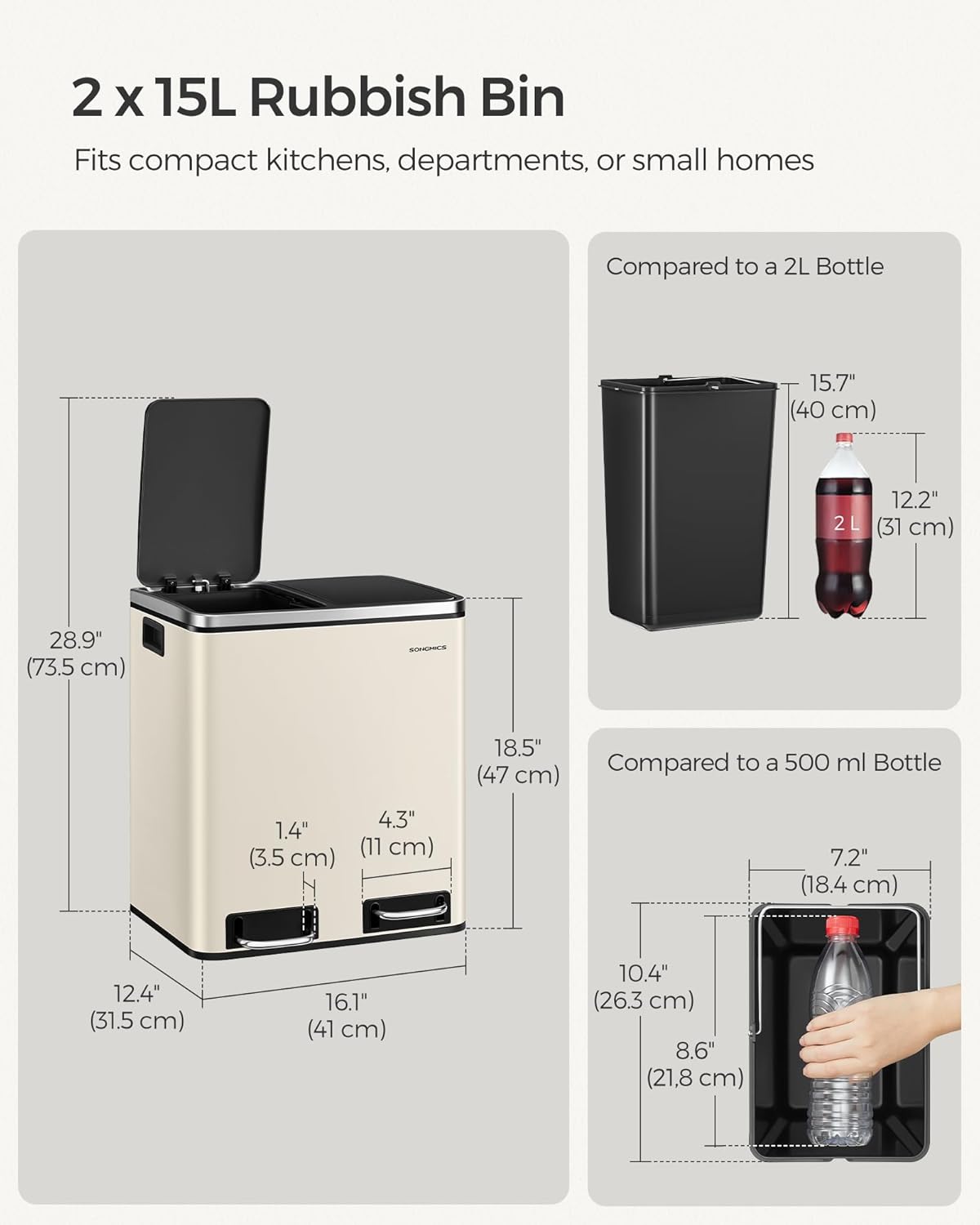 De to rum giver dig mulighed for enkelt at sortere almindeligt affald og genanvendelige materialer. Hvert rum har en aftagelig inderspand, fodpedal og låg, så du kan åbne dem separat og uden besvær.