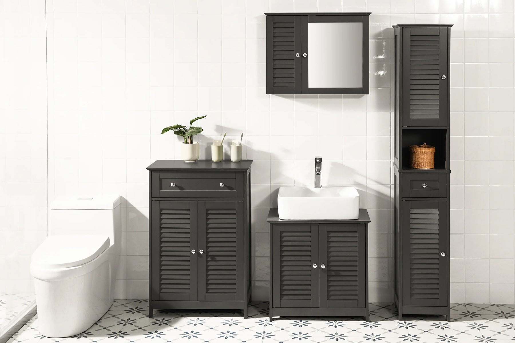 Brug skabet til at organisere alt fra håndklæder og rengøringsmidler til personlige plejeprodukter. Med to døre, en skuffe og en åben hylde har du masser af plads. De lameller på dørene giver god ventilation, hvilket reducerer fugt og forebygger dårlig lugt.