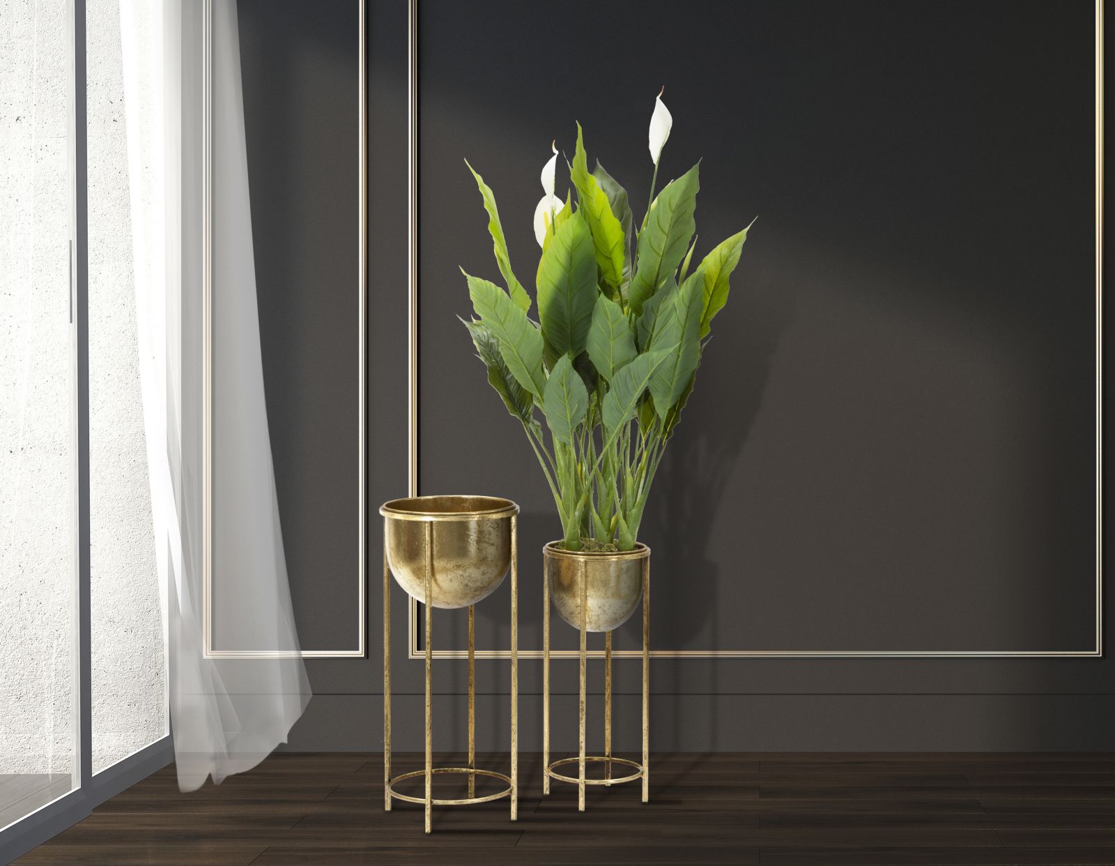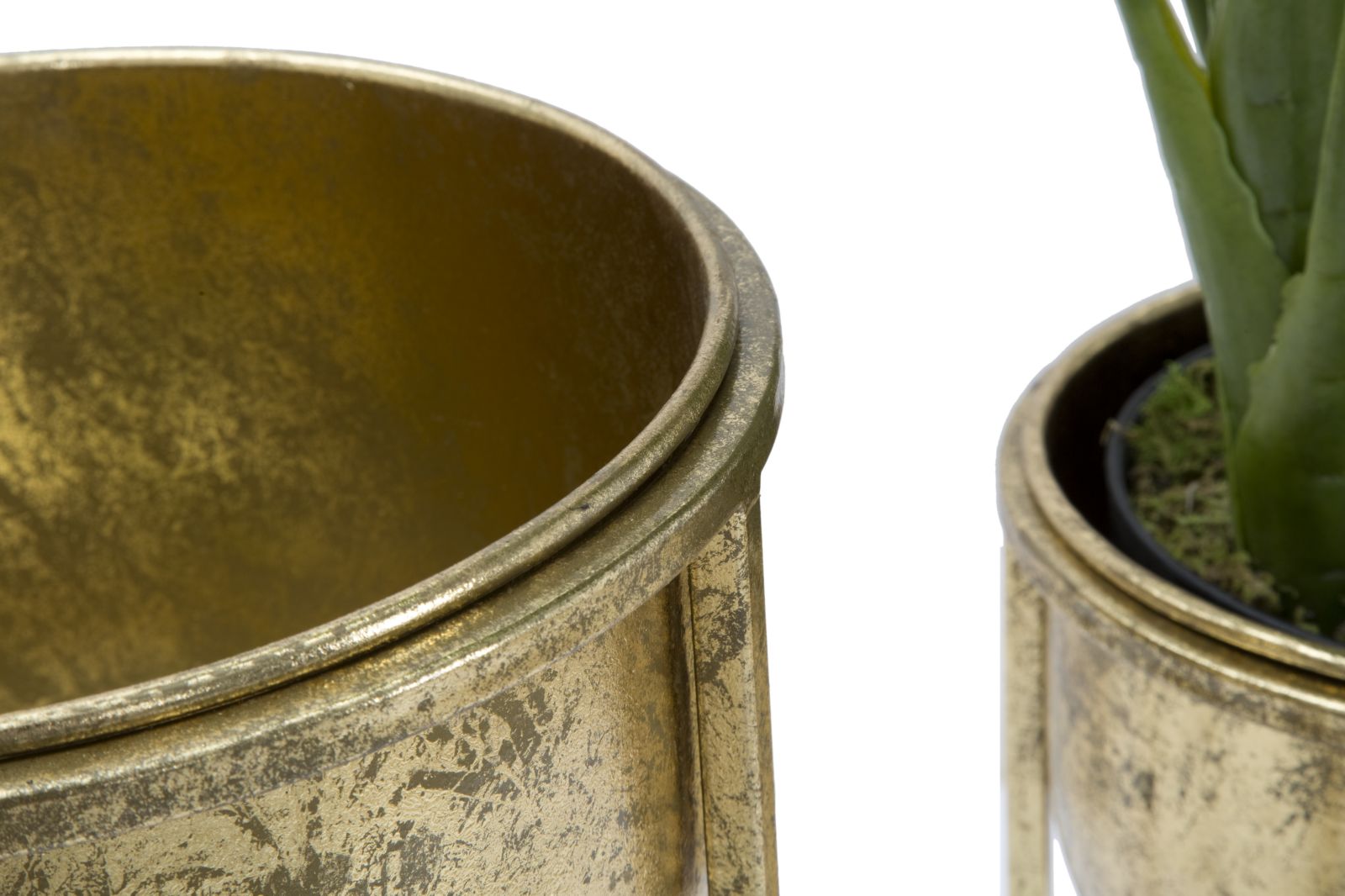 Sættet består af to elegante plantestativer i gyldent metal med matchende baser. Skålene er aftagelige, hvilket gør rengøringen nem og bekvem. Den gyldne farve giver et stilfuldt og eksklusivt udtryk, der passer perfekt til en elegant indretning.