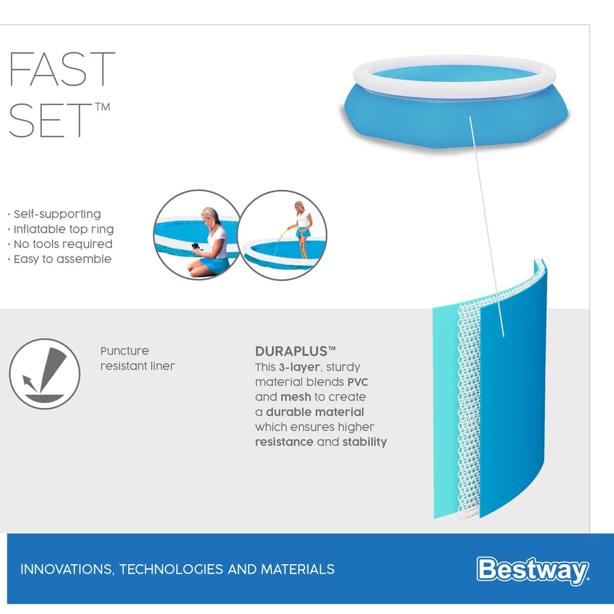 Denne Bestway havepool er en fantastisk badelyst for hele familien. Enkel montering på plant underlag: Blæs luftringen op, fyld poolen med vand. Komplet! Poolen retter sig selv op og kommer i form. Vandkapaciteten er 3.800 liter ved 80 % fyldning.
