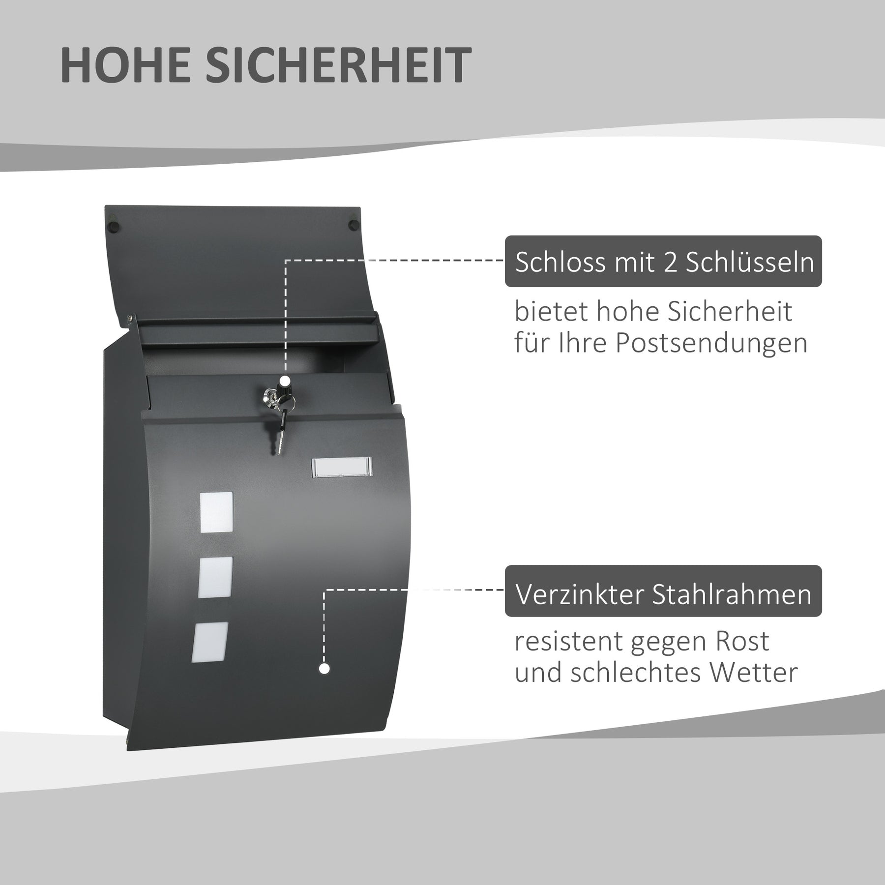 Sikre din post med stil. Denne postkasse er lavet af galvaniseret stål, hvilket gør den robust og holdbar til udendørs brug. Det 30 cm lange brevindkast giver nem adgang til at sende post, mens det aflåselige design holder din post sikker og privat.