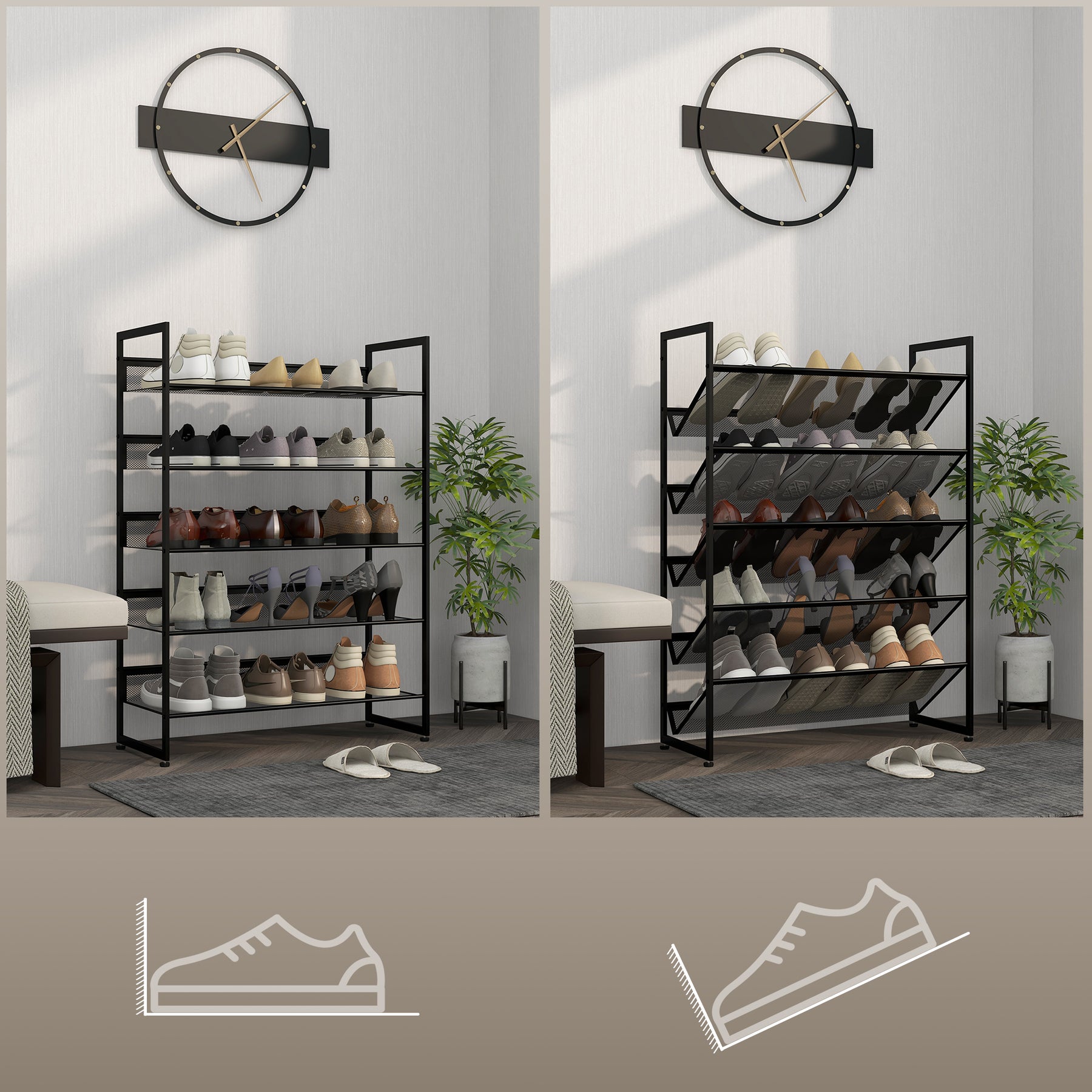 Optimer din bolig med denne elegante skoreol, der er specielt designet til familier, der ønsker at udnytte hver en centimeter effektivt. Med sit stilfulde design i 5 niveauer tilbyder den plads til op til 15 par sko (op til EU 44) og sikrer optimal ventilation takket være nethylderne.