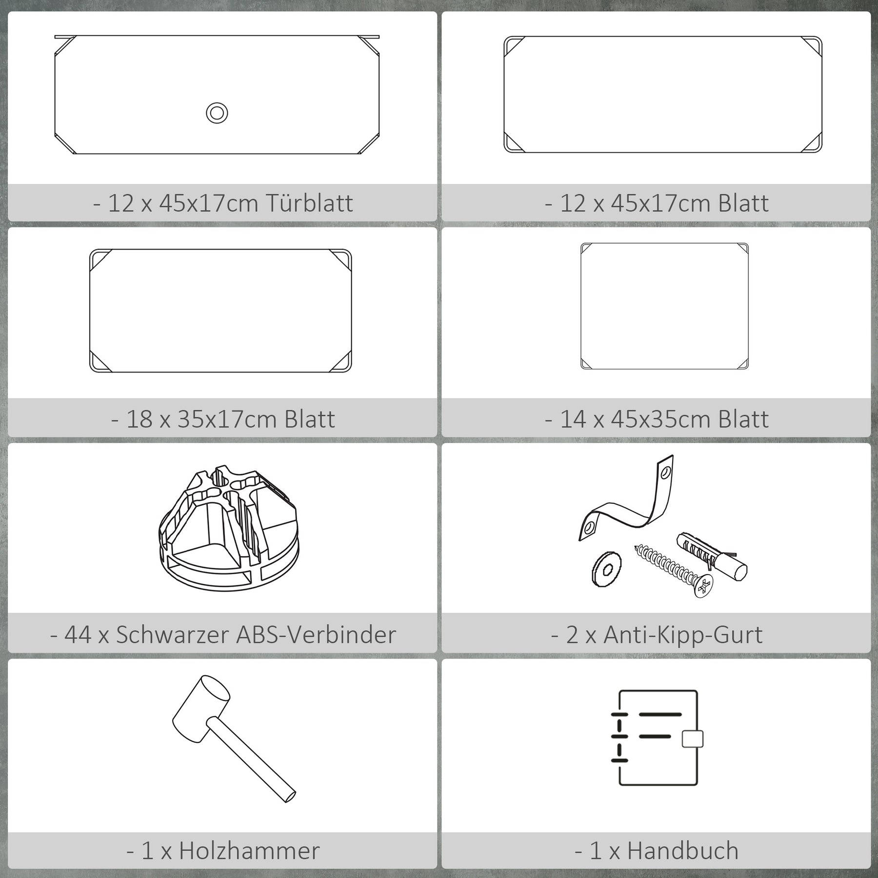 Leveringsomfang: 12 x 48 x 17 cm plade, 18 x 35 x 17 cm plade, 14 x 45 x 35 cm plade, 44 x Sorter ABS-propper, 2 x anti-tip, 2 x anti-tip hammer, 1 x manual.