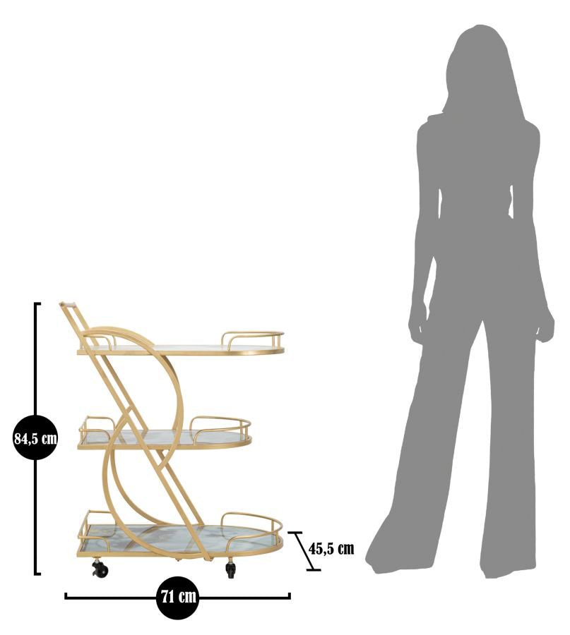 Med sin gyldne metalstruktur og et geometrisk design bestående af to halvcirkler skaber serveringsvognen et unikt udtryk. Den er udstyret med tre glashylder med en smuk, marmorlignende forarbejdning, og farvekontrasten giver et elegant touch.