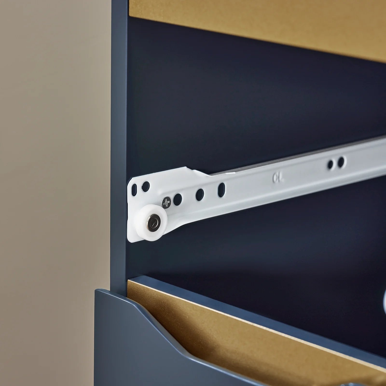 Forestil dig et strejf af ro og orden i dit hjem med dette elegante, slanke møbel i en forfriskende blå farve. Det er ikke bare et møbel – det er en smart løsning, der kombinerer moderne design med praktisk funktionalitet. De runde metalgreb tilføjer et unikt stilfuldt touch, der fanger øjet og løfter rummets æstetik.