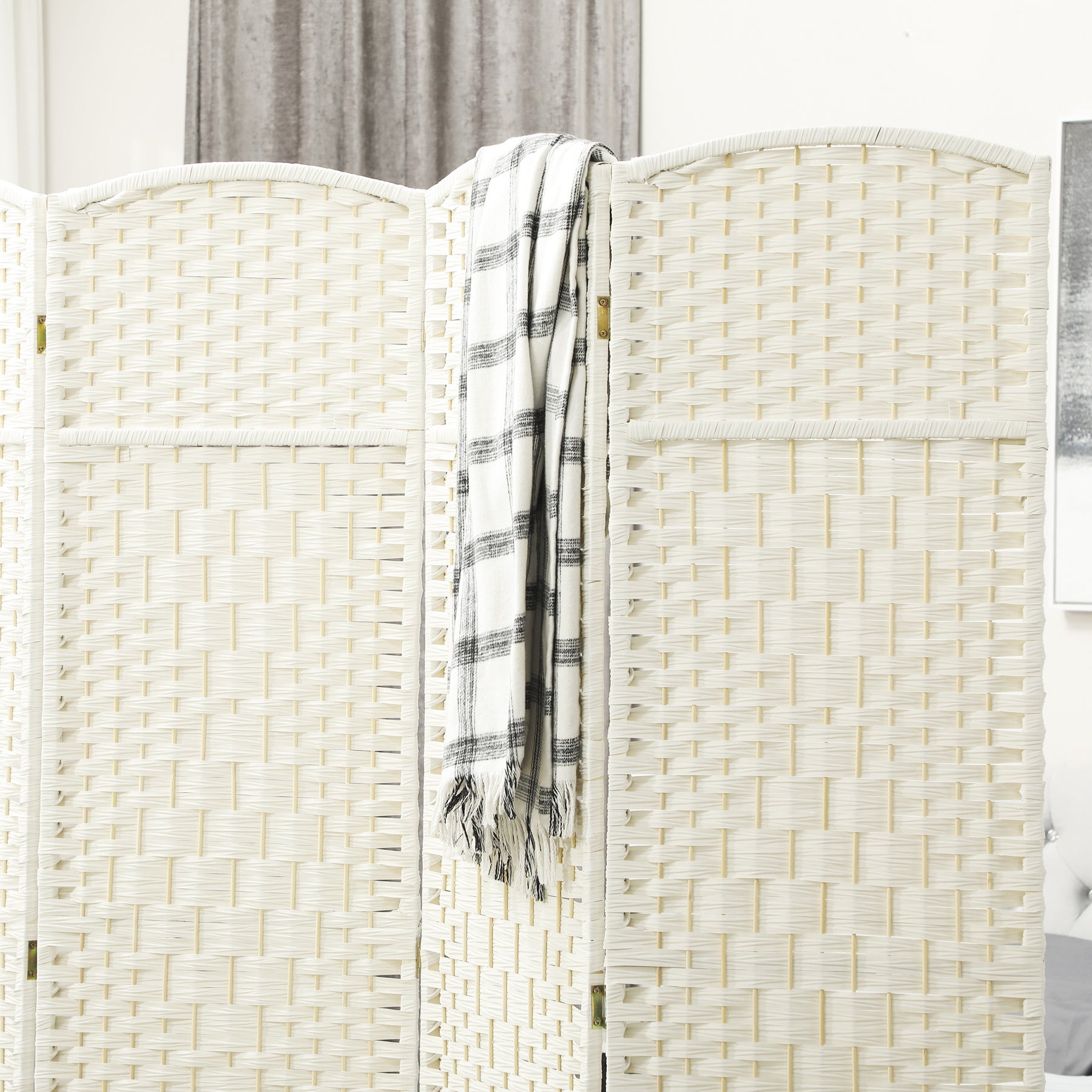 Forvandl dit rum med denne stilfulde rumdeler. Den robuste polypropylenstruktur giver maksimal privatliv og overgår traditionelle papirfibre i holdbarhed. Det foldbare design med fire paneler og ni metalhængsler sikrer nem opbevaring og fleksibilitet.