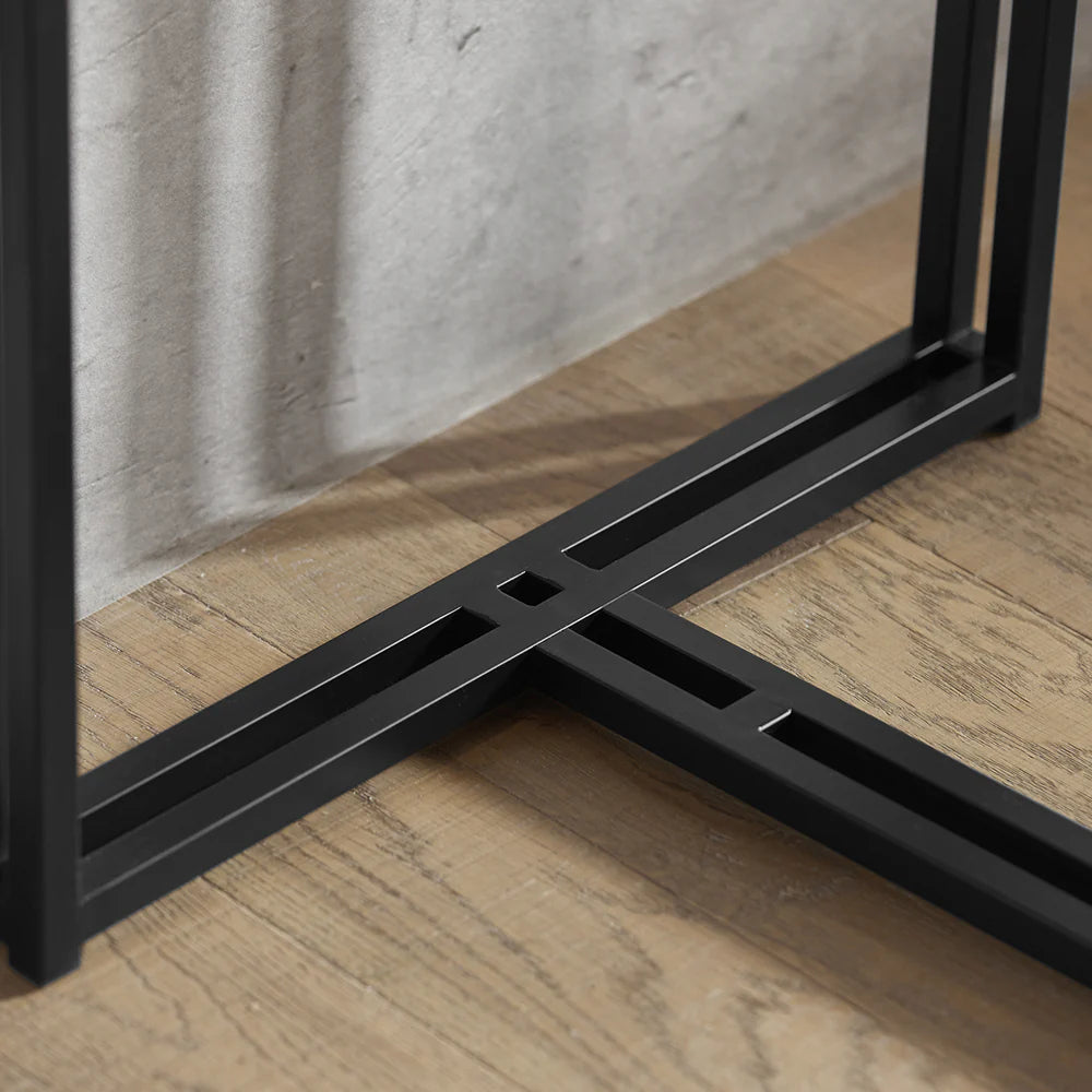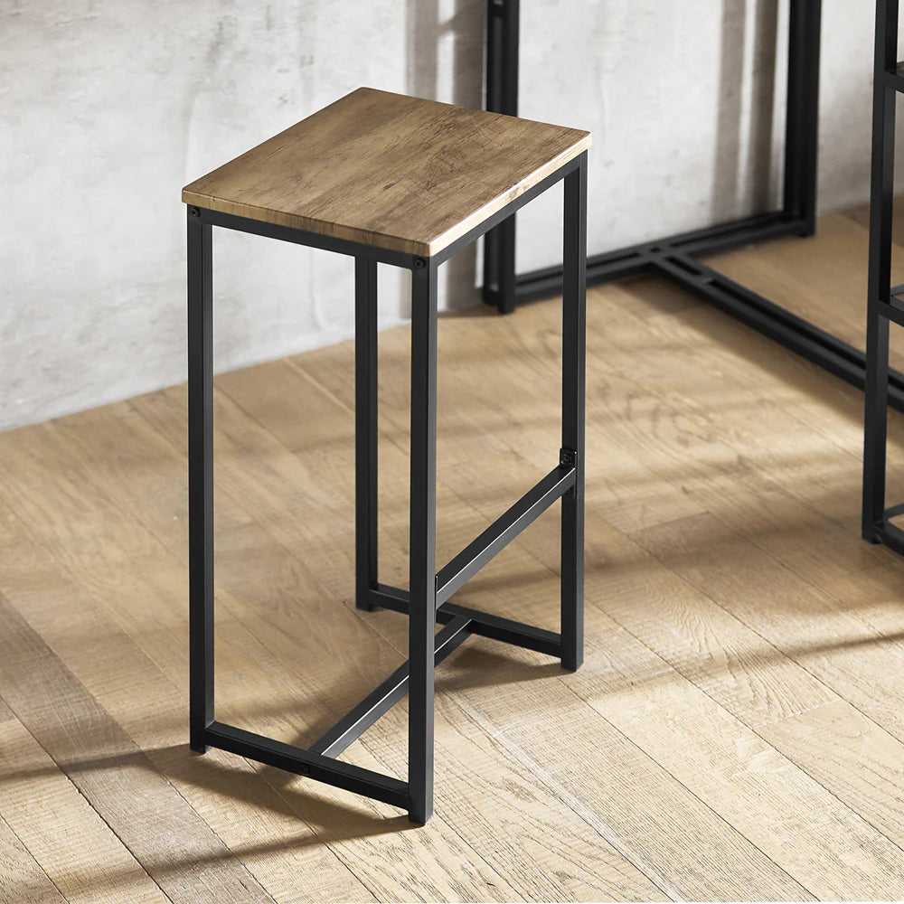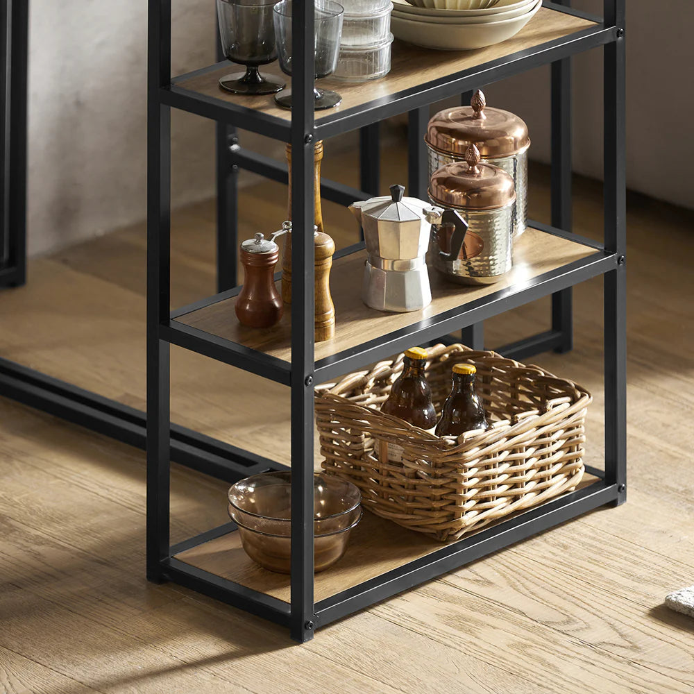 Bordet har tre hylder, der giver masser af opbevaringsplads til vinflasker, glas eller andre ting. Sættet er fremstillet af holdbart MDF med et flot træ-look og en robust sort pulverlakeret stålramme, der sikrer stabilitet og lang levetid.