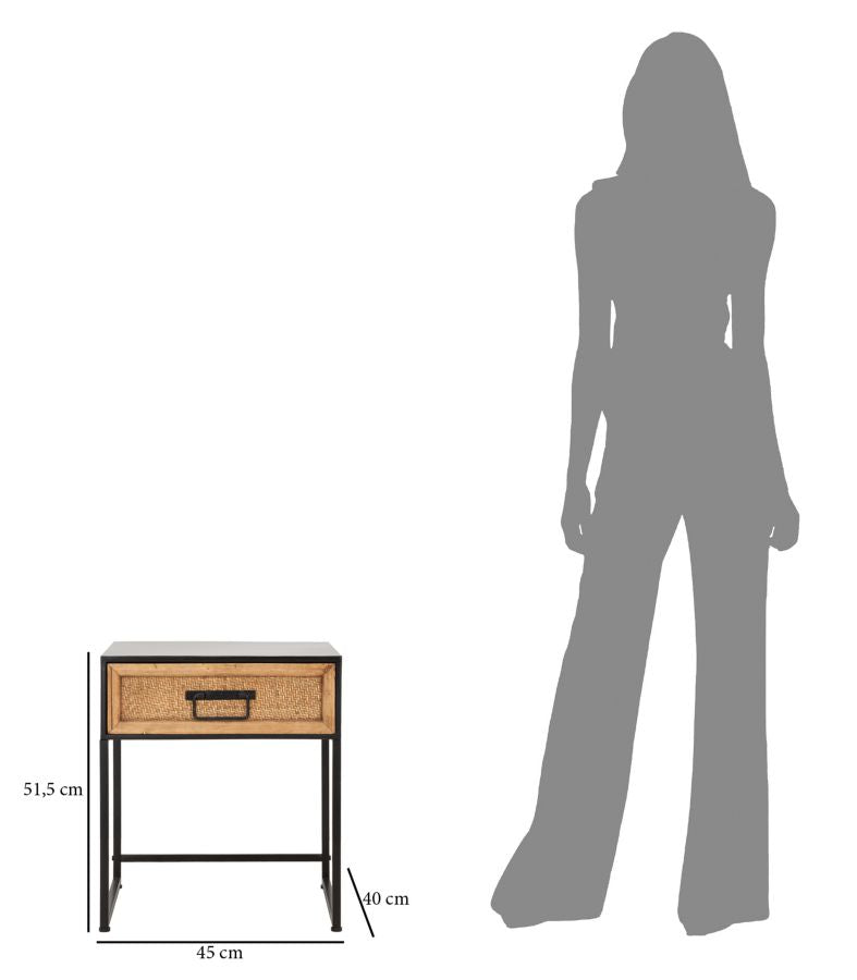 Med et enkelt og lineært design passer dette natbord til enhver type indretning. Det har en skuffe, der er udformet, så den minder om fletværk af rattan, hvilket giver et unikt og fængslende look. Bordets kombination af industrielt metal og naturlige elementer skaber et iøjnefaldende midtpunkt i ethvert rum.