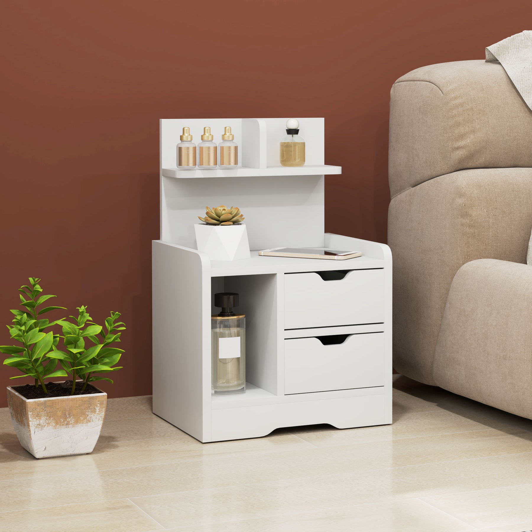 Opdag det stilfulde sidebord, der vil puste nyt liv i dit hjem. Dette natbord kombinerer elegance og funktionalitet og tilbyder alsidig opbevaringsplads til vækkeure, bøger og planter. Med to praktiske skuffer er det ideelt til personlige ejendele og sikrer orden.