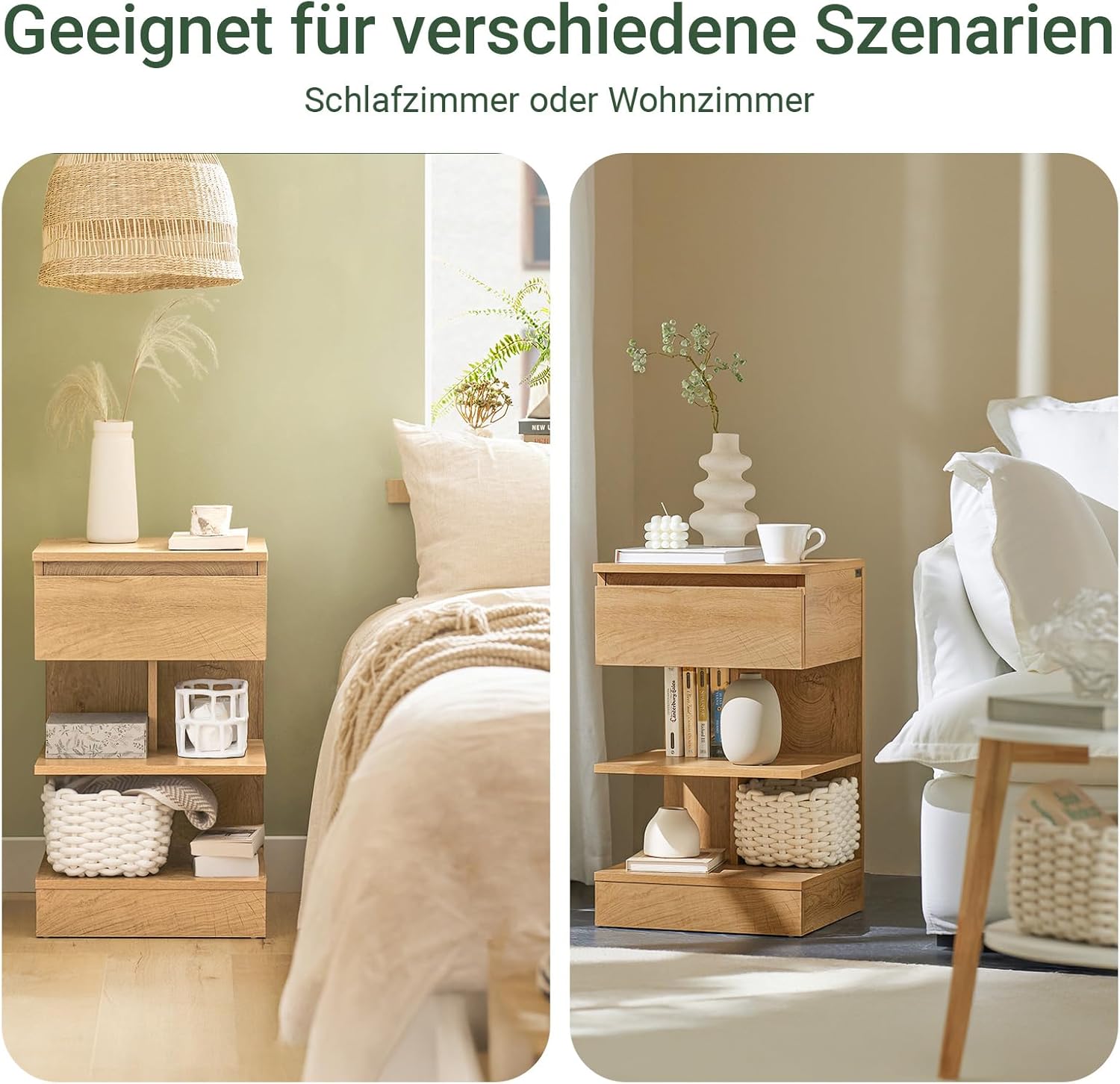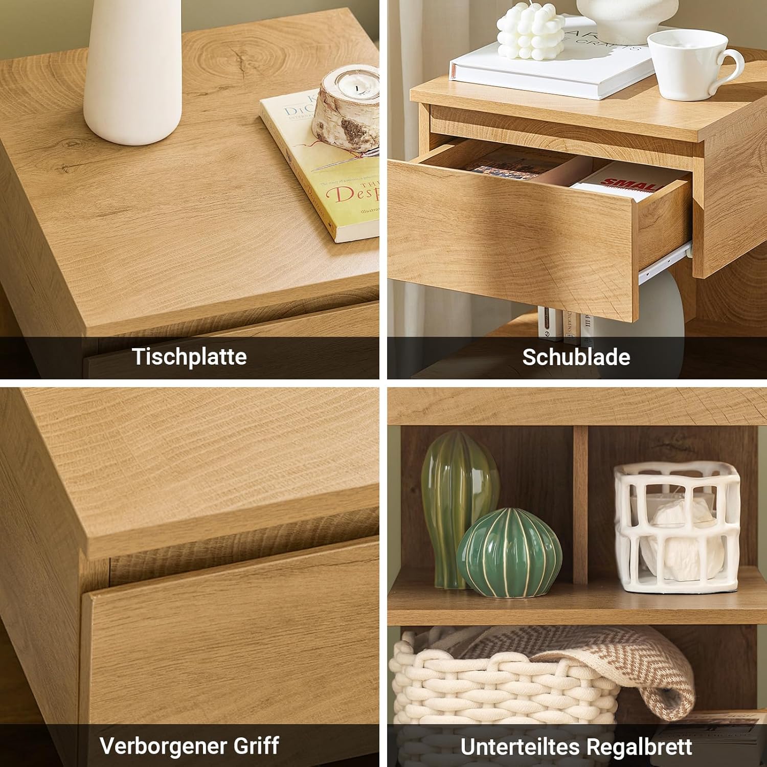 Med 1 rummelig skuffe med 2 åbne hylder - perfekt til at organisere vigtige ting ved sengen som bøger, briller eller opladere i dit soveværelse eller stue.