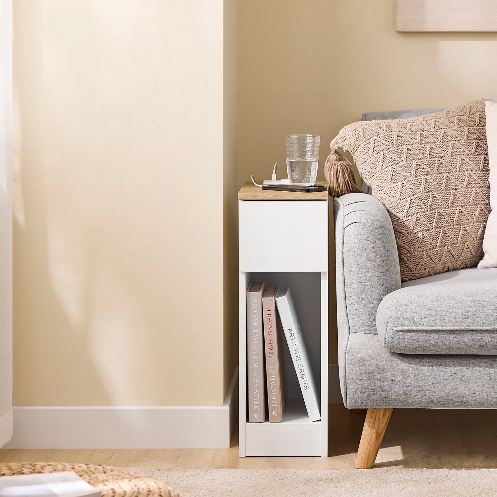 Med en indbygget strømbane med standardudtag, USB-port og Type-C-port, gør dette smalle nattbord det nemt at lade flere enheder på én gang. Den medfølgende 1,5 m kabel er CE og ROHS-certificeret.