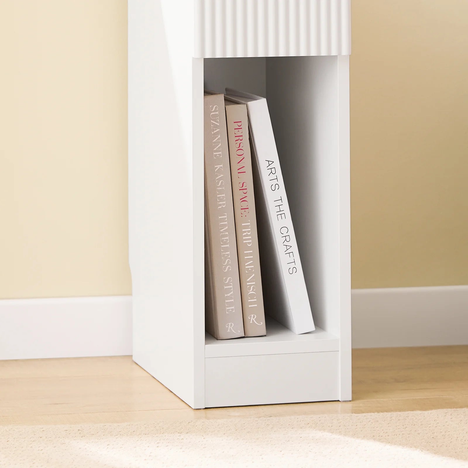 Stilfuldt, smalt sengebord med bølge-design og skuffe, hvid (20 x 60 x 35 cm)