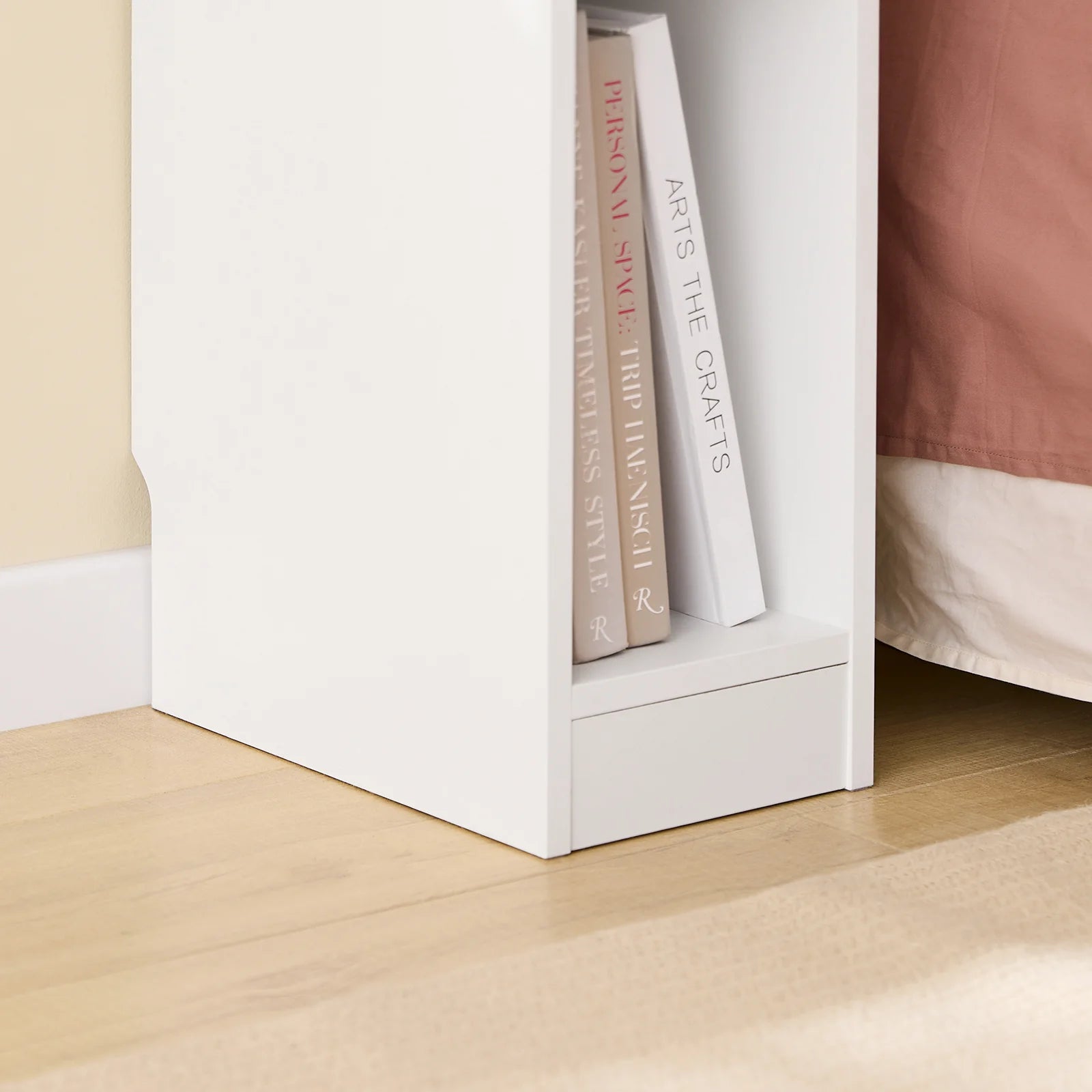 • Designet til små rum: Med en bredde på kun 20 cm passer sengebordet perfekt ind i smalle hjørner og trange områder. Det har en udskæring på bagsiden, så det kan stå helt tæt op ad væggen, selvom der er en fodliste.