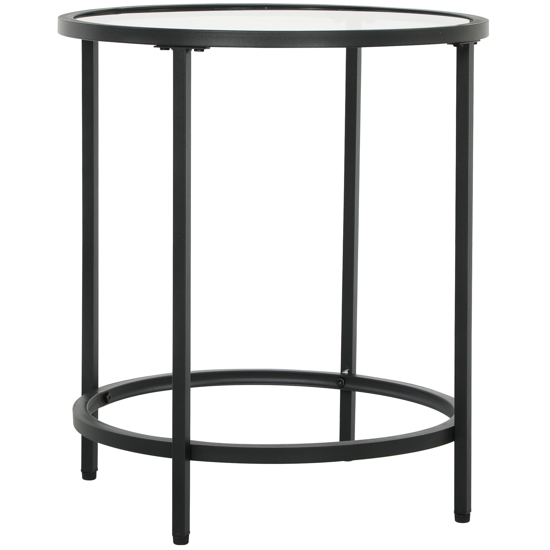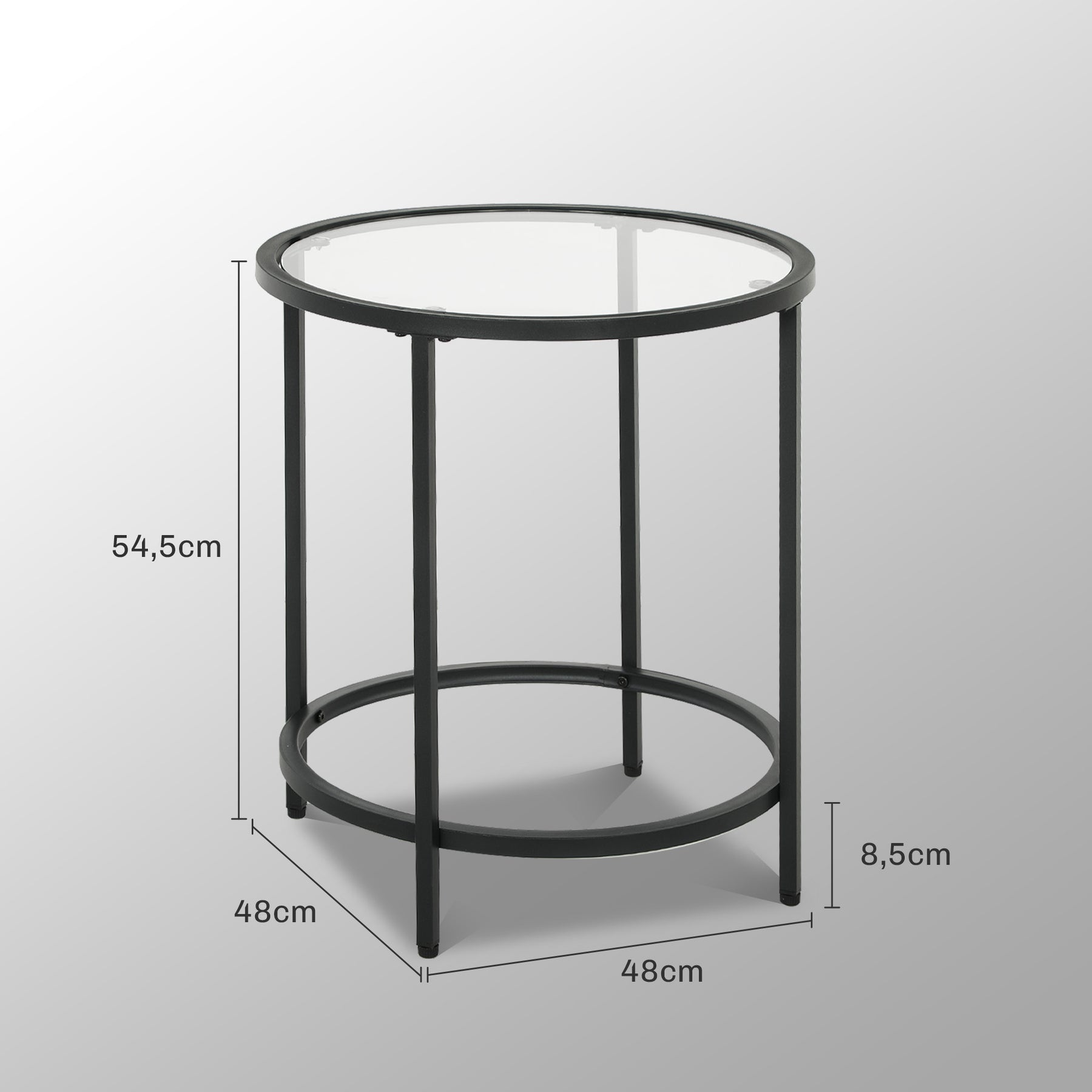 Tilføj moderne elegance til din stue med dette stilfulde sofabord. Den klare, hærdede glasplade og den robuste metalramme gør det ideelt som et lille sofabord eller natbord. Fodpuder beskytter også dine gulve mod ridser, hvilket gør det til et praktisk valg.