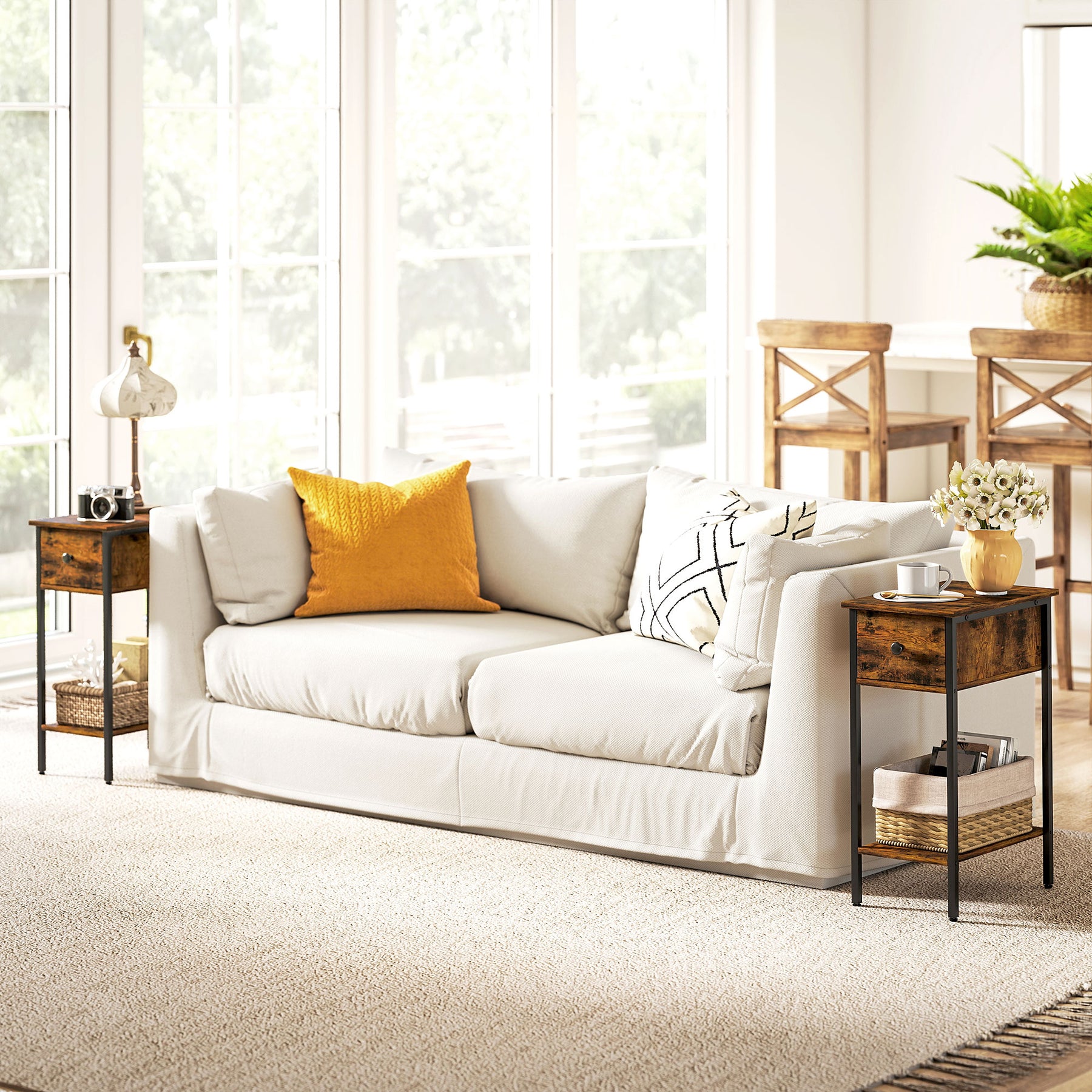 Oplev et stilfuldt, slankt sidebord, der kombinerer praktisk design med moderne charme. Med en praktisk skuffe og et åbent rum er det perfekt til opbevaring af hverdagsting. De rustikke, brune paneler og den elegante, solide ramme giver et stilfuldt præg til ethvert rum, uanset om det bruges som natbord, sidebord eller et yndigt lille sofabord.