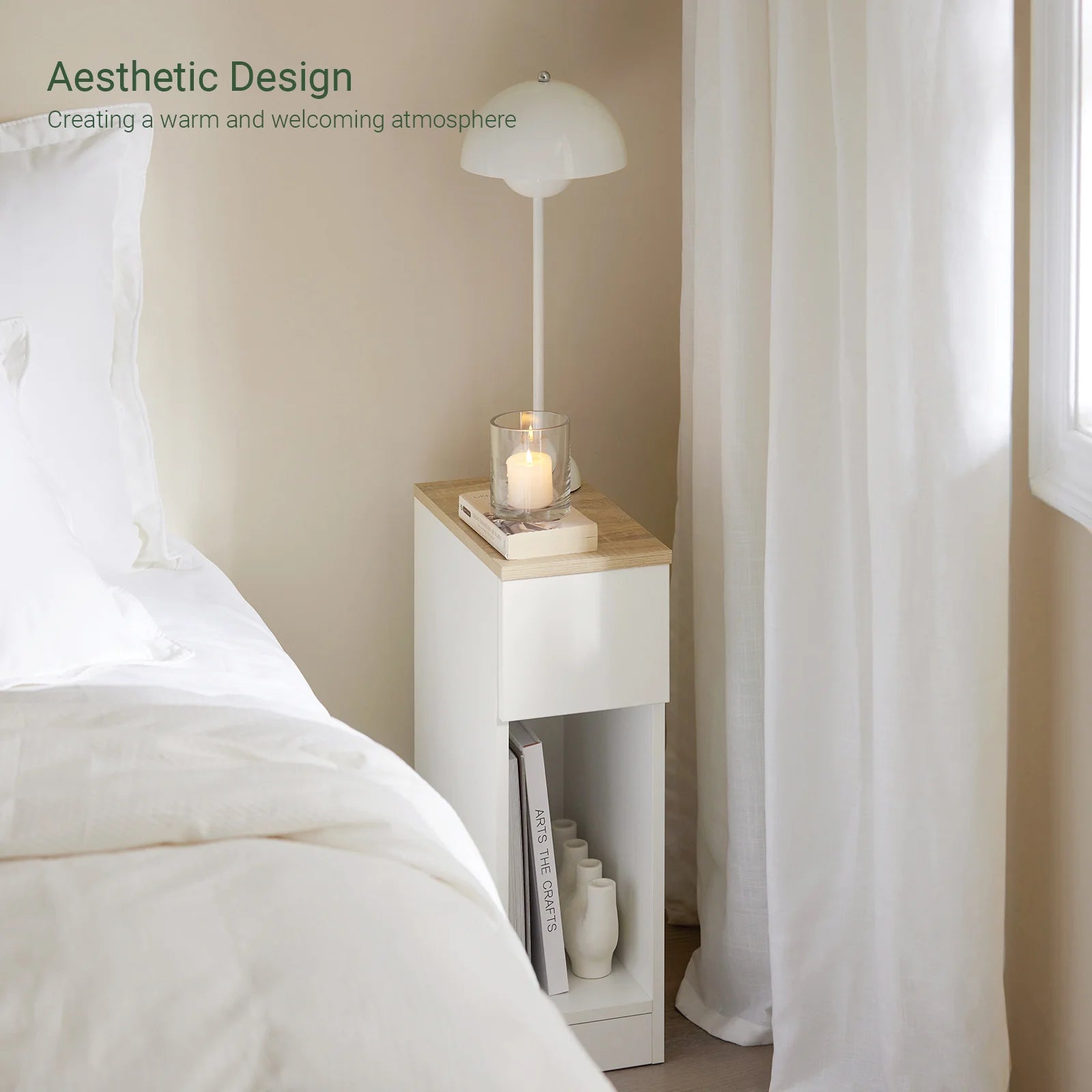 Enkel, moderne og pladsbesparende sengebord, skandi-look, B20 x D35 x H60 cm, hvid