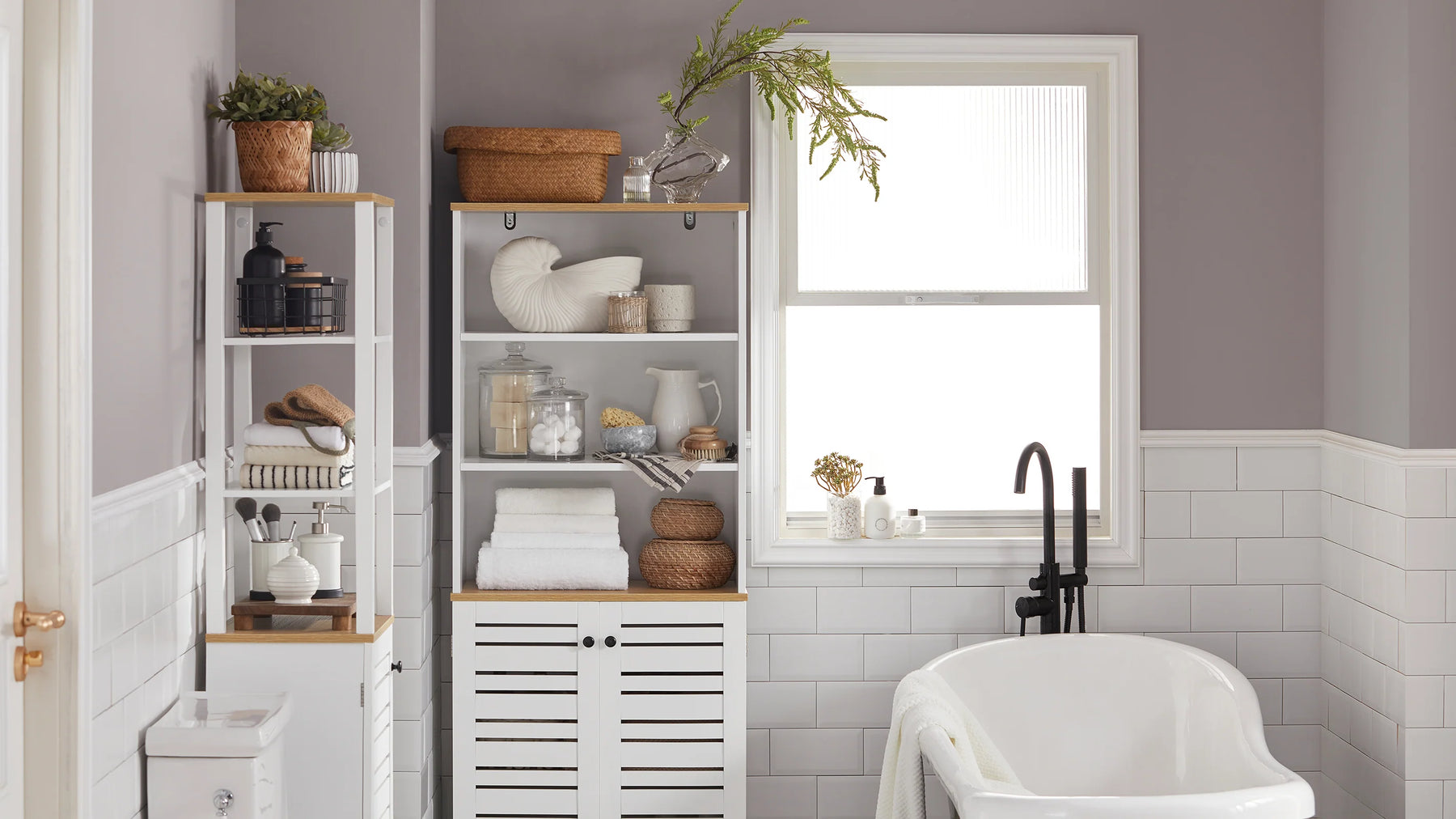 Skabet har tre åbne hylder og et rummeligt skab med en justerbar hylde, der giver masser af opbevaringsplads til alle dine fornødenheder. Lågerne med lameller sikrer god ventilation, hvilket reducerer fugt og forebygger mug. For at give dig en personlig stil medfølger der både sorte og sølvfarvede håndtag.
