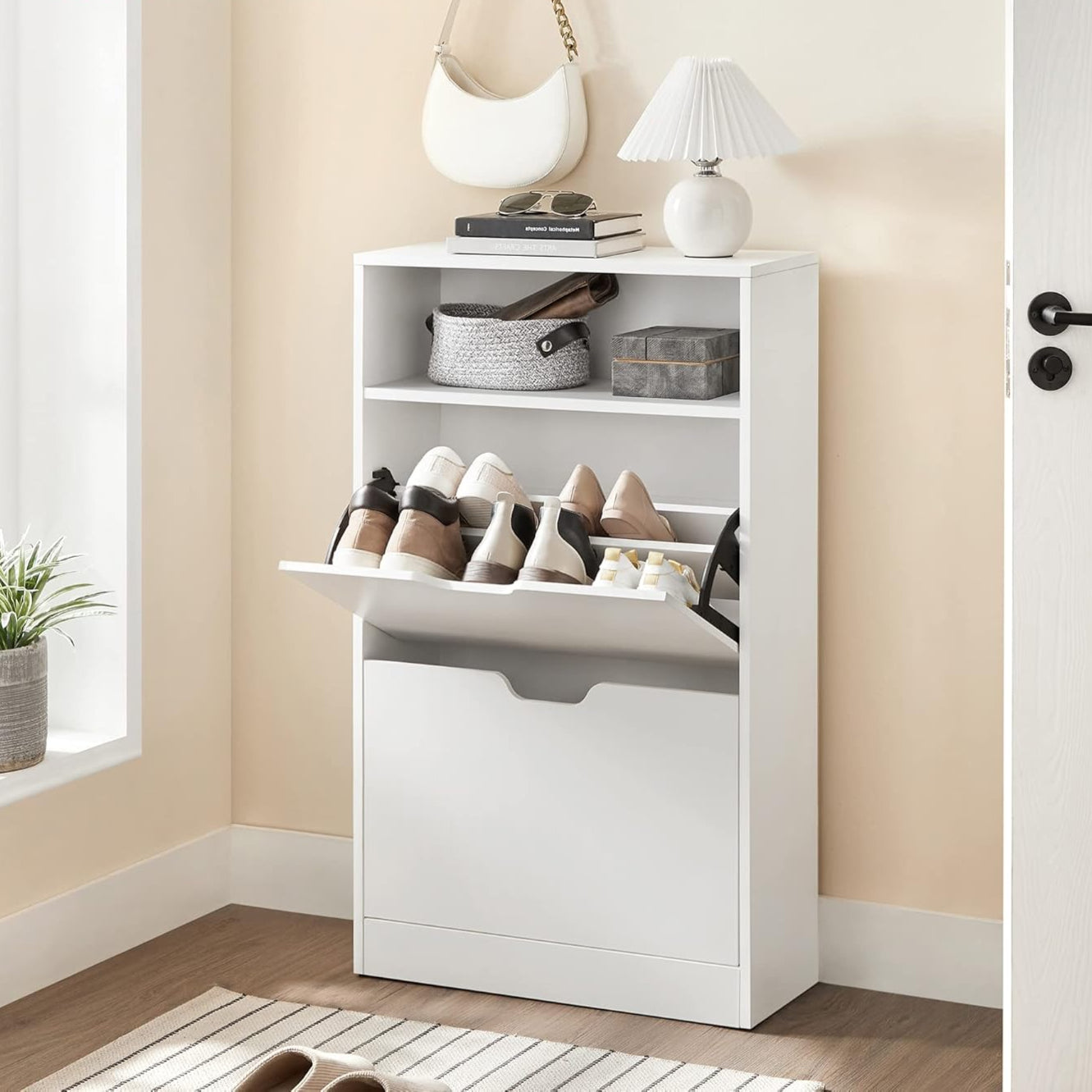 Skabet har to praktiske klapper, som kan rumme op til 12 par damesko eller 8 par herresko. Du kan nemt fjerne skillevæggene, hvis du har brug for plads til støvler eller pumps.