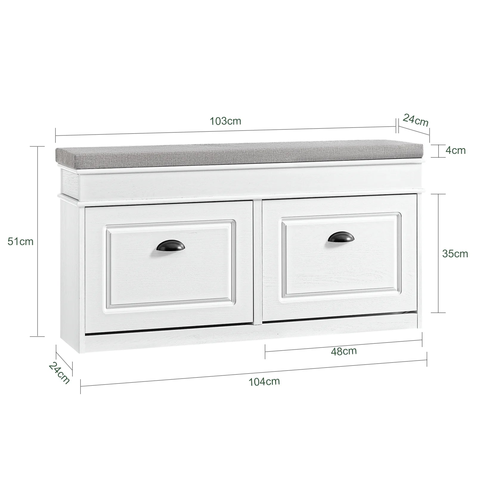 Elegant og pladsbesparende skobænk med sæde i hvid vintage-træ-effekt (104 x 51 x 24 cm)
