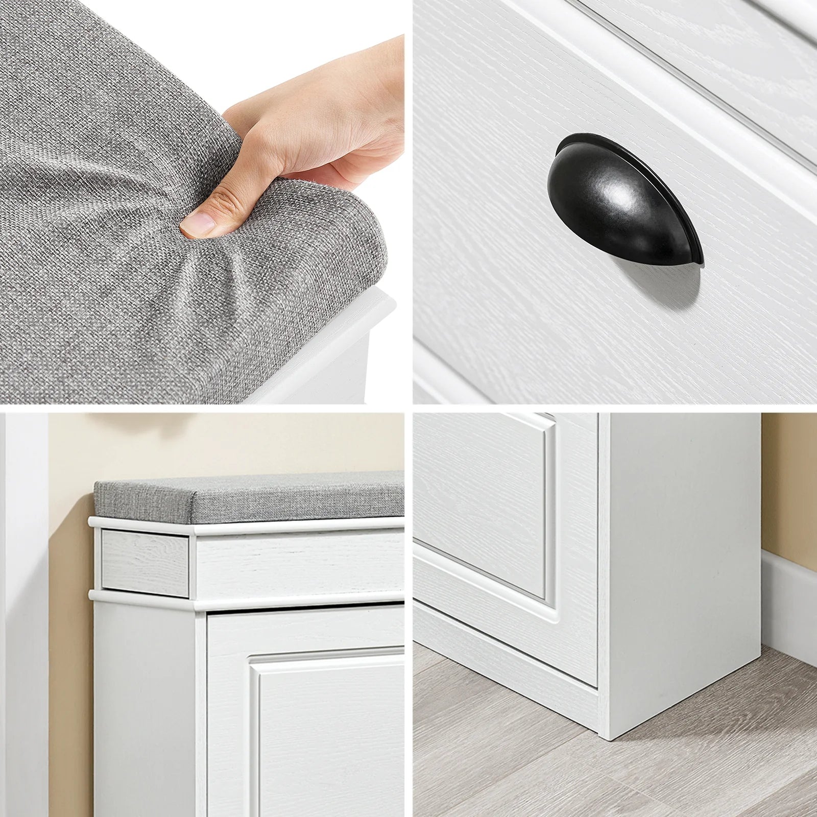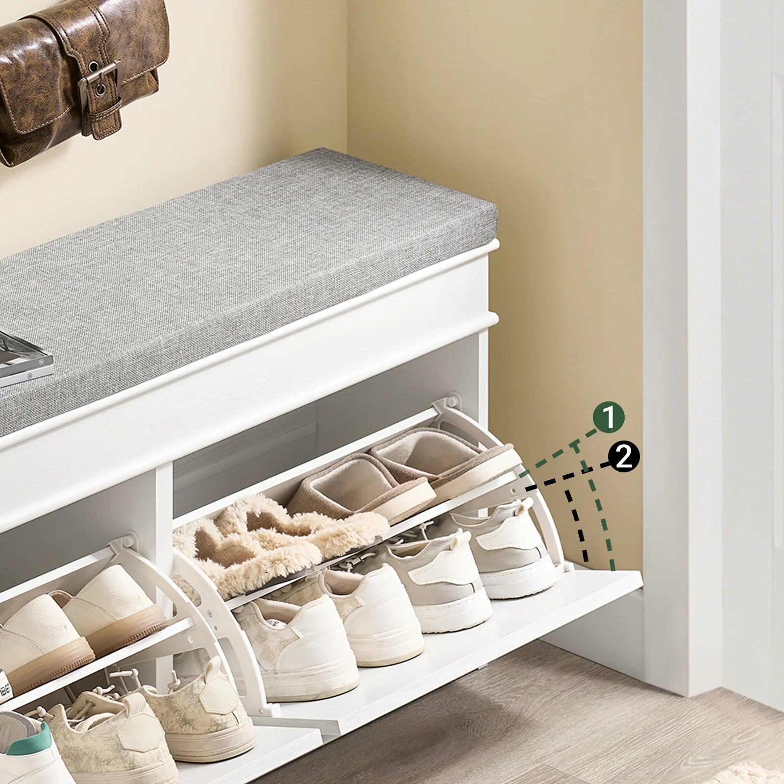 • Smart 2-i-1-design: Bænken kombinerer et praktisk skoskab med en behagelig siddehynde. Du kan nemt gemme op til 8 par sko bag to elegante klapper, så din entré altid ser ryddelig ud. Den integrerede skuffe er perfekt til opbevaring af småting som nøgler eller skohorn.
