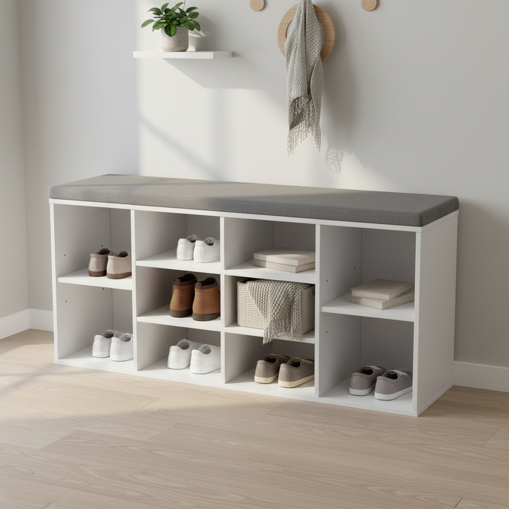 Smart skoopbevaring sikrer orden i entréen. Et skoskab skjuler sko elegant, mens en skobænk giver komfortabel siddeplads.