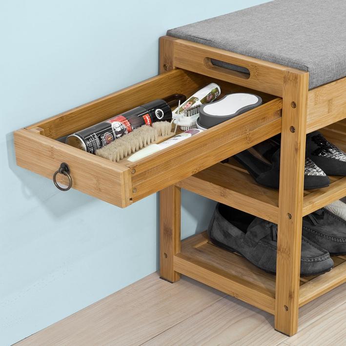 Udstyret med 2 små skuffer, 2 hylder til sko og 1 hylde til støvler.