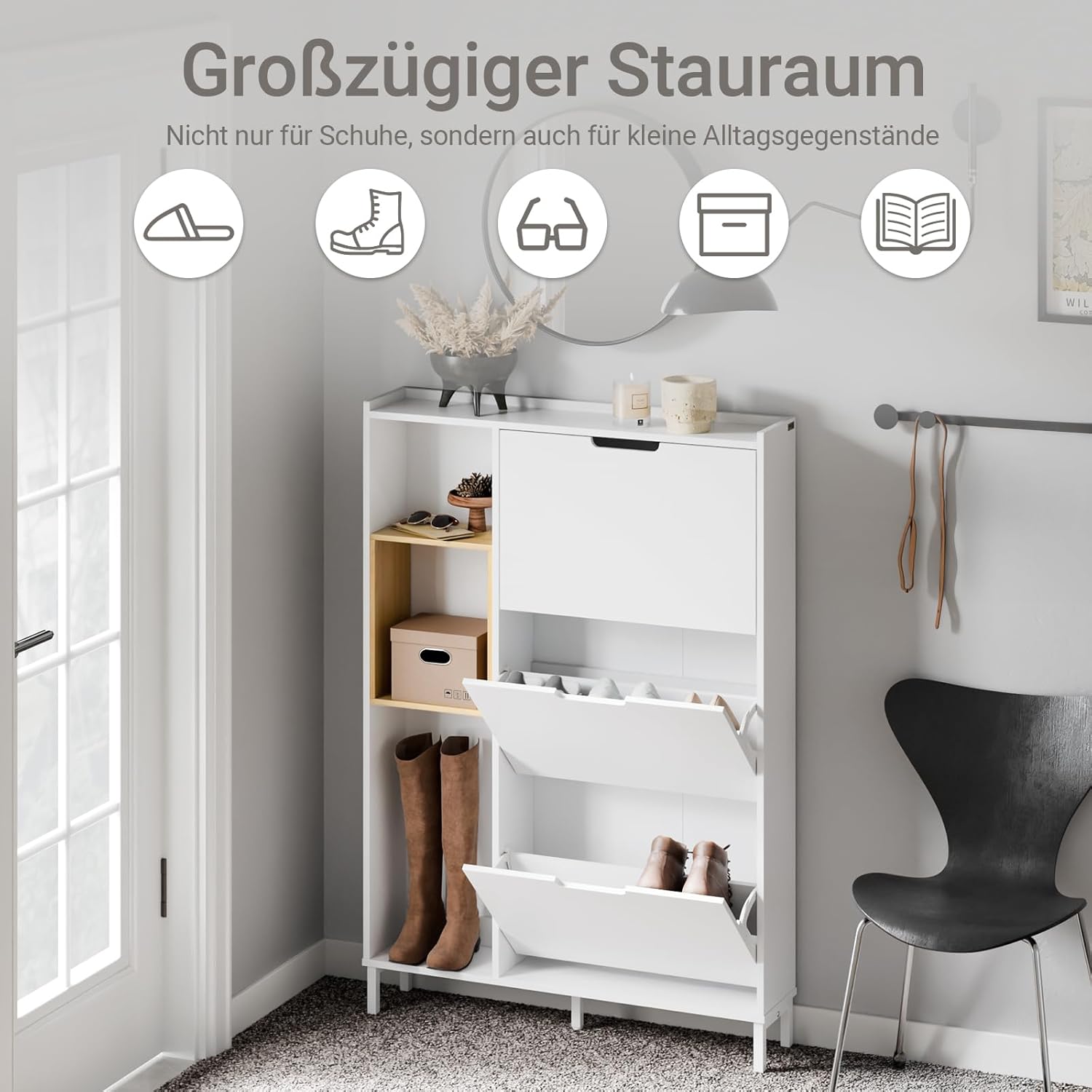 Dette skoskab med slank højde har 3 klapper, der kan rumme op til 9 par sko. Den åbne træramme skaber desuden plads til dekorative genstande, bøger eller andre småting og øger dermed funktionaliteten som en lukket skohylde.