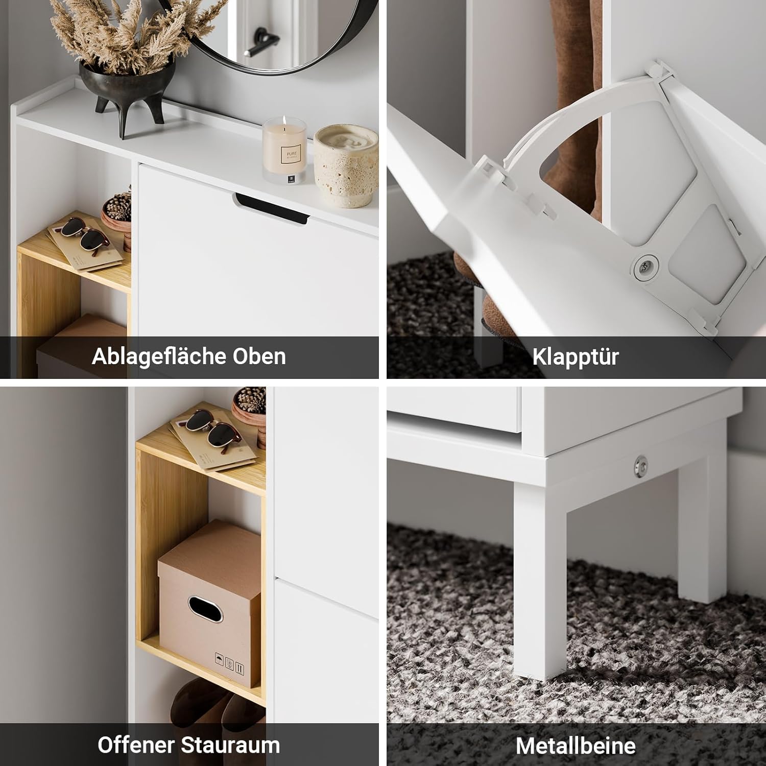 Det hvide skoskab kombinerer det klassiske hvide med bambusens naturlige look. Det tidløse design passer perfekt ind i ethvert rumdesign, uanset om det er et smalt skoskab til små gange eller som en skohylde for ekstra opbevaringsplads.