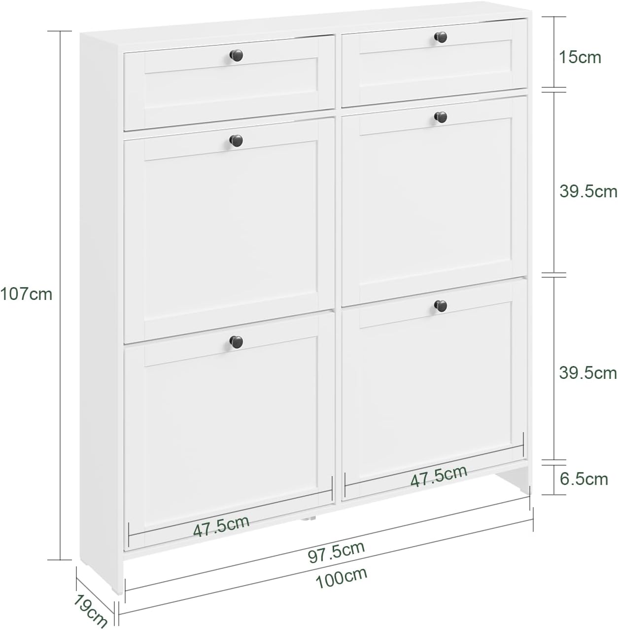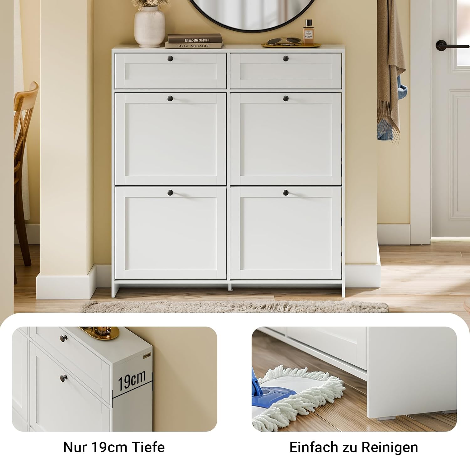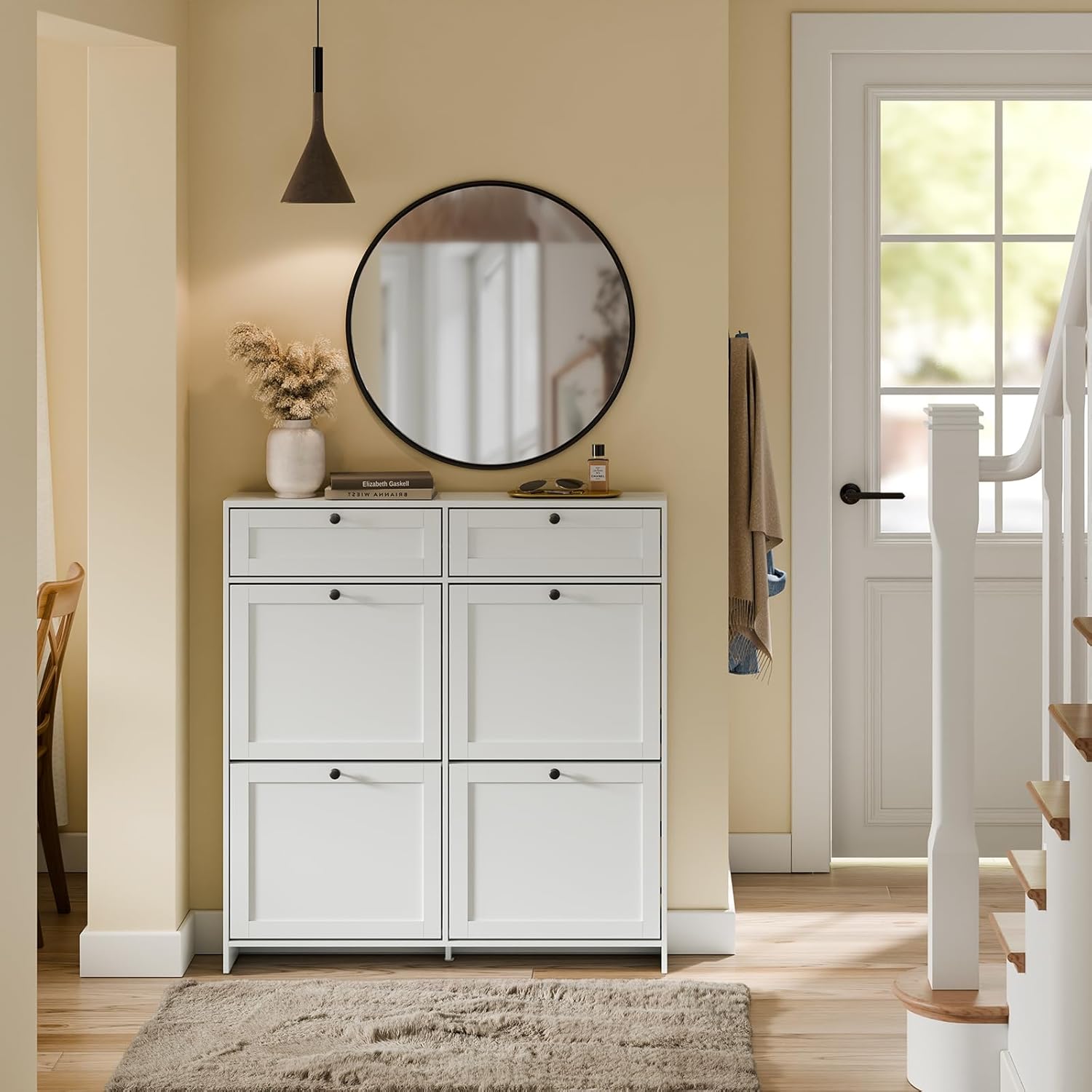 Det hvide skoskab i nordisk stil med sorte håndtag kombinerer elegant design med praktisk funktionalitet. Den er lukket som en smal skohylde og giver en pæn og stilfuld opbevaringsløsning til dine sko.