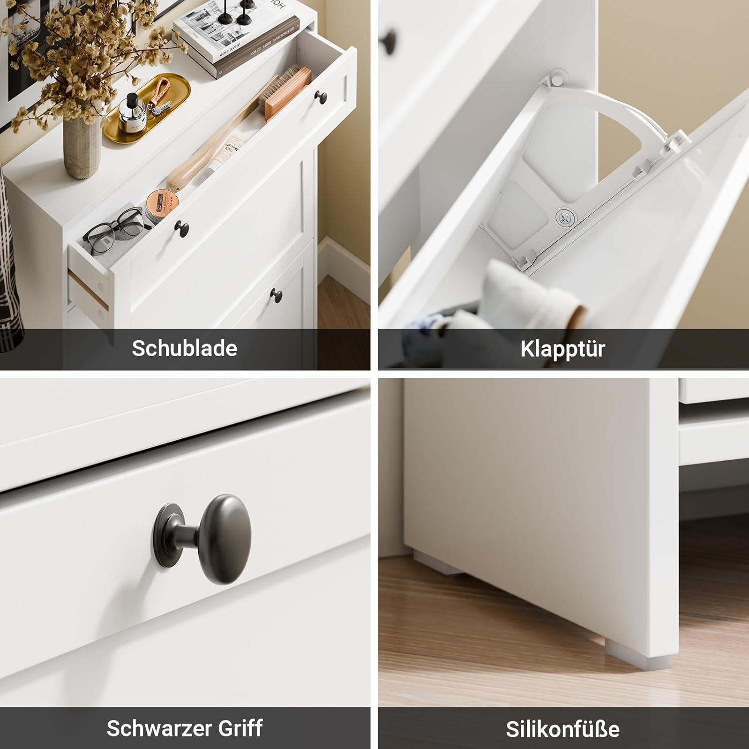 Skoskabet højt giver plads nok til op til 8 par sko. Med skuffer til småting og foldedøre til opbevaring af dine sko, forbliver din gang pæn og velorganiseret.