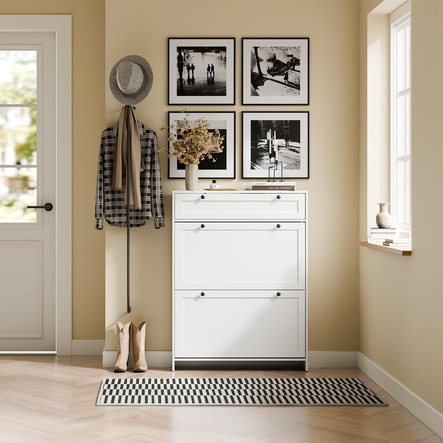 Det hvide skokommode passer perfekt til moderne gangarealer og passer stilfuldt ind i ethvert sæt af planker og korridorer. Kombinationen af hvid og sort giver et elegant og tidløst look.