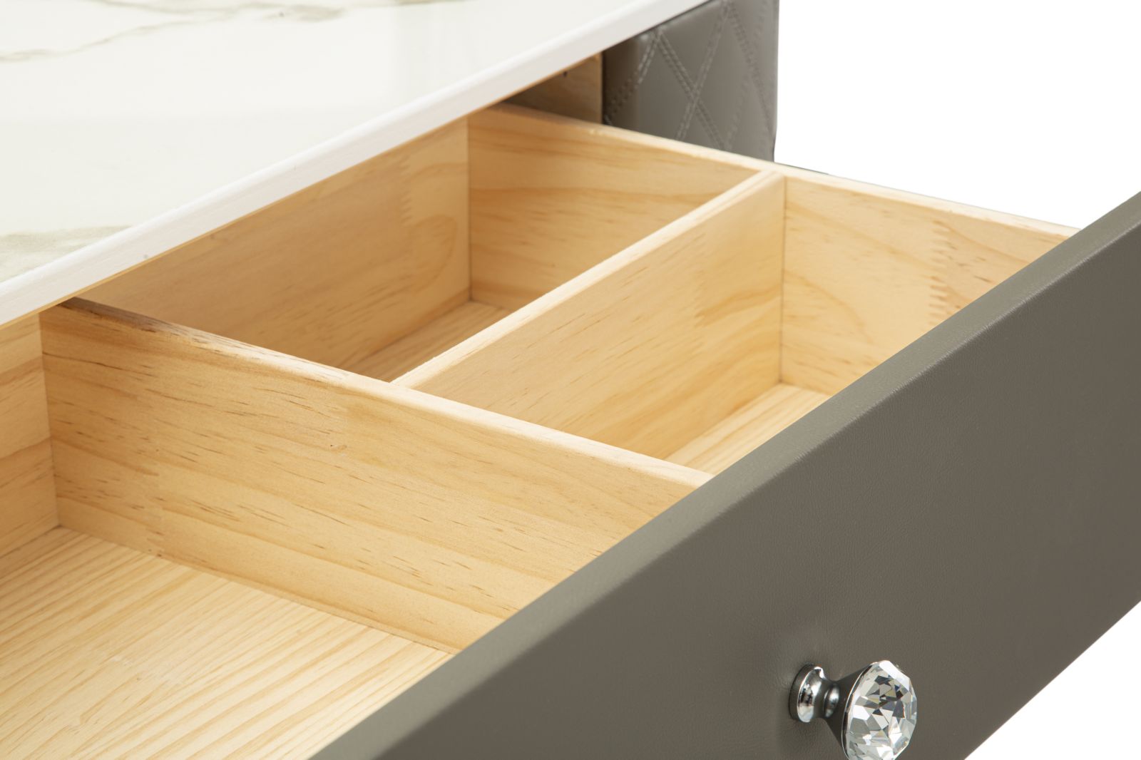 Glam sminkebord med skammel i sølv af fyrretræ træ, mdf, metal and plast – 120x40x75 36x39 cm. Denne produkt fra serien Glam kombinerer funktion og design. Den er fremstillet af fyrretræ træ, MDF, metal and plast og udstråler kvalitet og godt håndværk. Farven sølv giver et stilfuldt og eksklusivt udtryk. A luxurious and refined dressing table in quilted faux leather and silver metal structure, the marble-look top suggests luxury, and the diamond knobs shine with glamour. complete with round ottoman in faux leather quilted with silver metal base. Placer denne produkt i stuen, entréen eller på kontoret som et iøjnefaldende element. Et ideelt valg til dig, der ønsker en unik og smagfuld detalje i hjemmet.