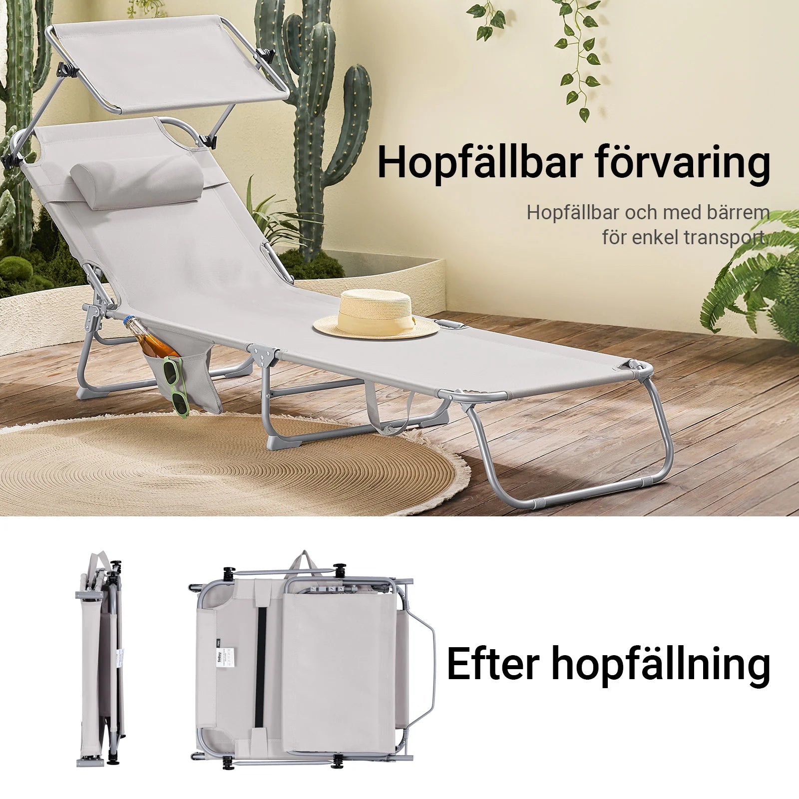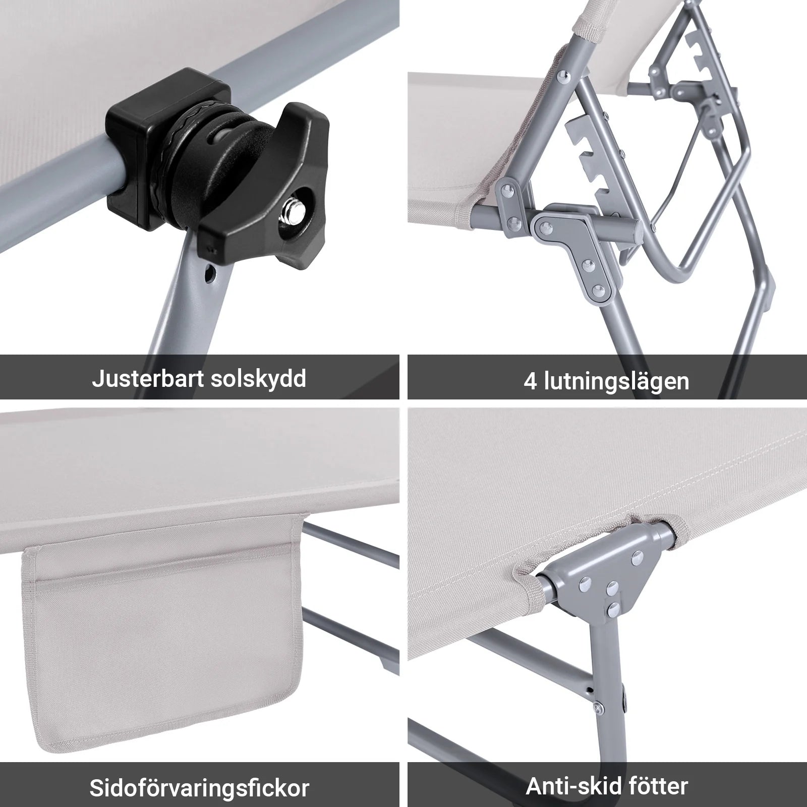 Med den smarte, drejelige solskærm får du effektiv skygge og beskyttelse mod solens stærke stråler. Den bløde, aftagelige nakkepude giver behagelig støtte til dit hoved og din nakke, mens ryglænet let kan justeres i fire positioner – fra 112° til en fuldt tilbagelænet position på 180°. Perfekt til afslappede eftermiddage i solen. Den praktiske sidelomme holder styr på din telefon, bog eller vandflaske, så du altid har det, du skal bruge, lige ved hånden.