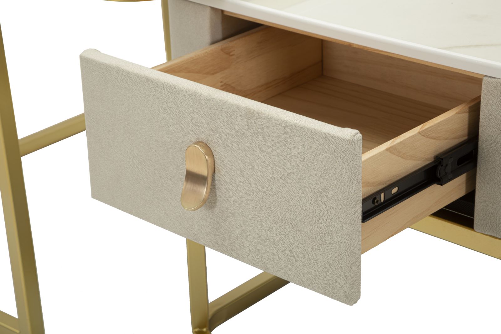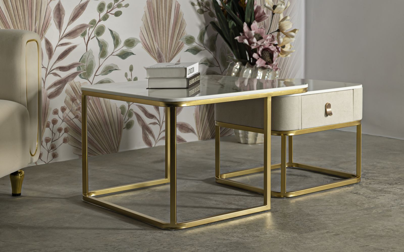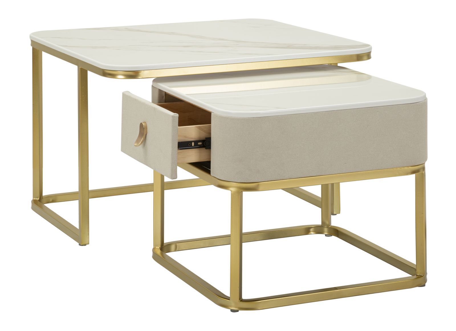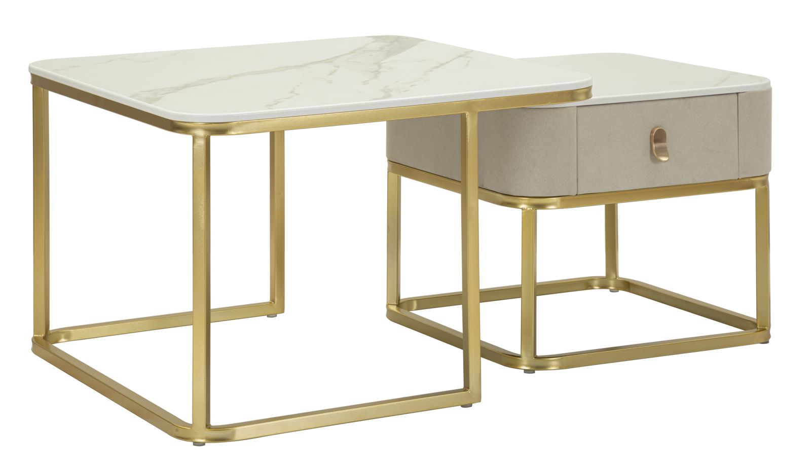 Sættet består af to borde med en smuk guldfarvet metalstruktur og en stilfuld bordplade i marmoreffekt. Denne kombination skaber et stilfuldt og eksklusivt udtryk, der er perfekt til at berige stuen og andre sofistikerede miljøer.