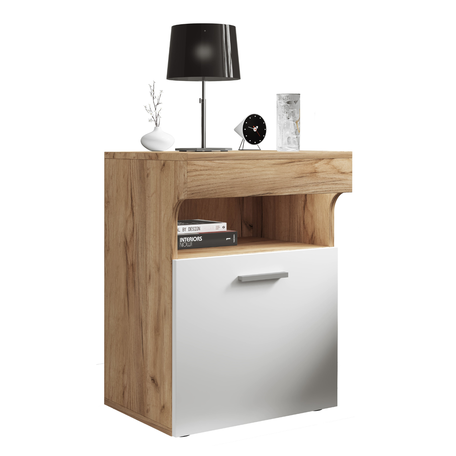 Natbordet har et moderne design med en unik øverste front, der giver møblet karakter. Det er solidt konstrueret med både lukket og åben opbevaring til praktisk brug ved sengen.