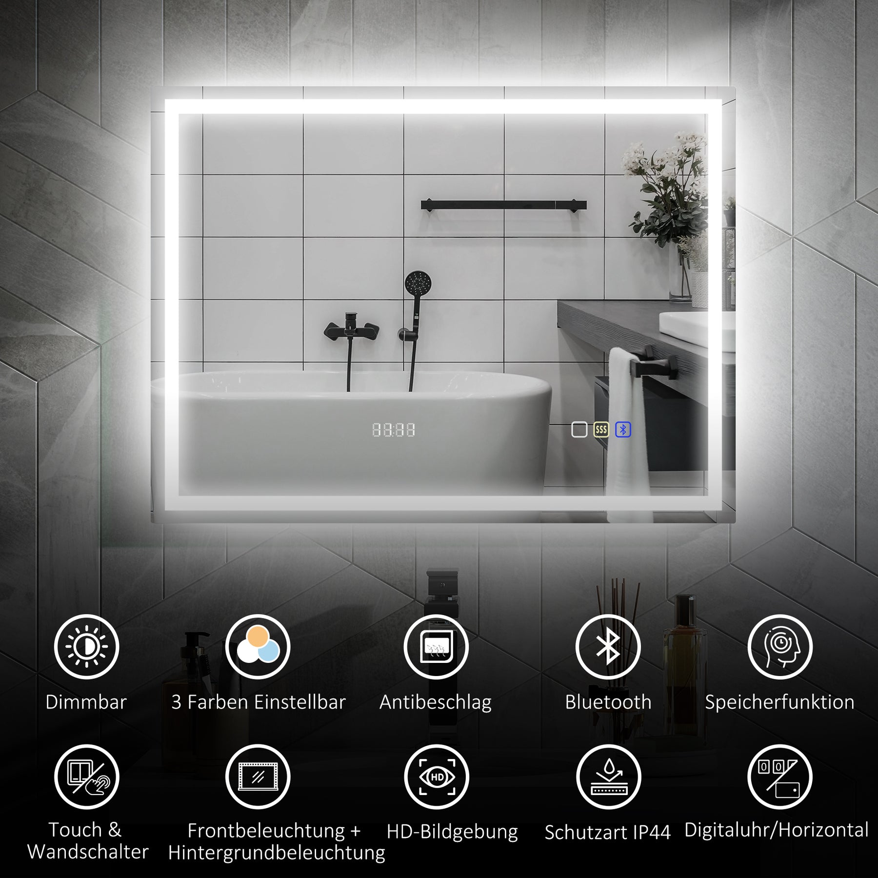 Badeværelsesspejl med led-belysning, antidugpude, 3 justerbare farver, ur, 600 x 800 mm, sølv