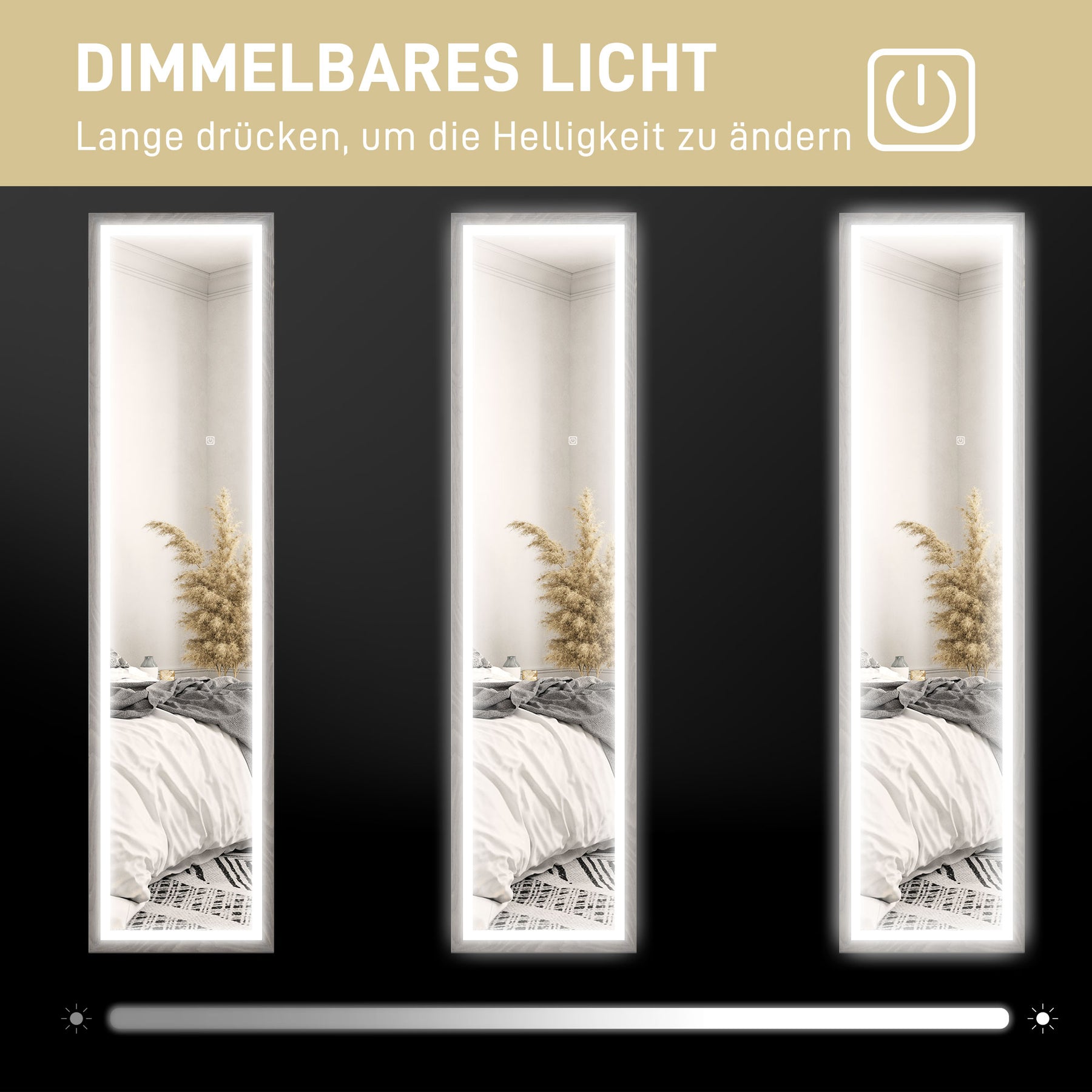 Oplev stil med dette gulvlange spejl, der giver et komplet overblik fra top til tå. Det rummelige spejl på 160 x 40 cm er indrammet af LED-lys og har en smart touch-knap, der gør det nemt at vælge mellem tre lysfarver og justere lysstyrken, så den passer til dit humør. Uanset hvor det placeres, tilfører det et elegant præg til ethvert rum.