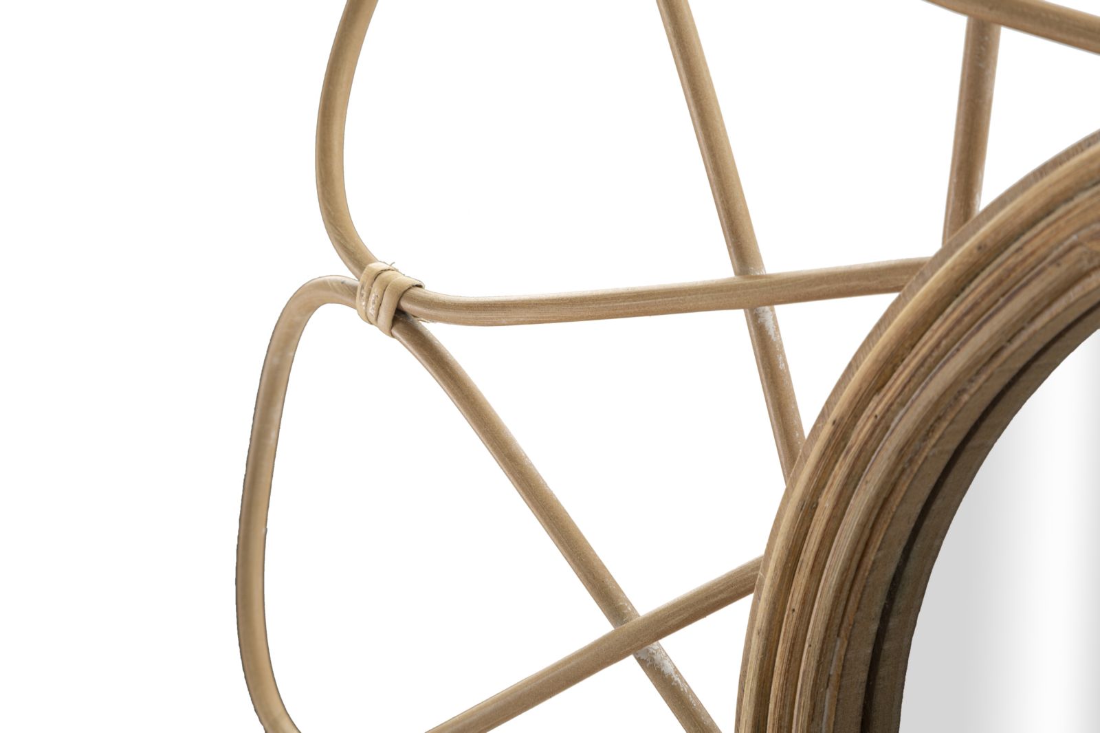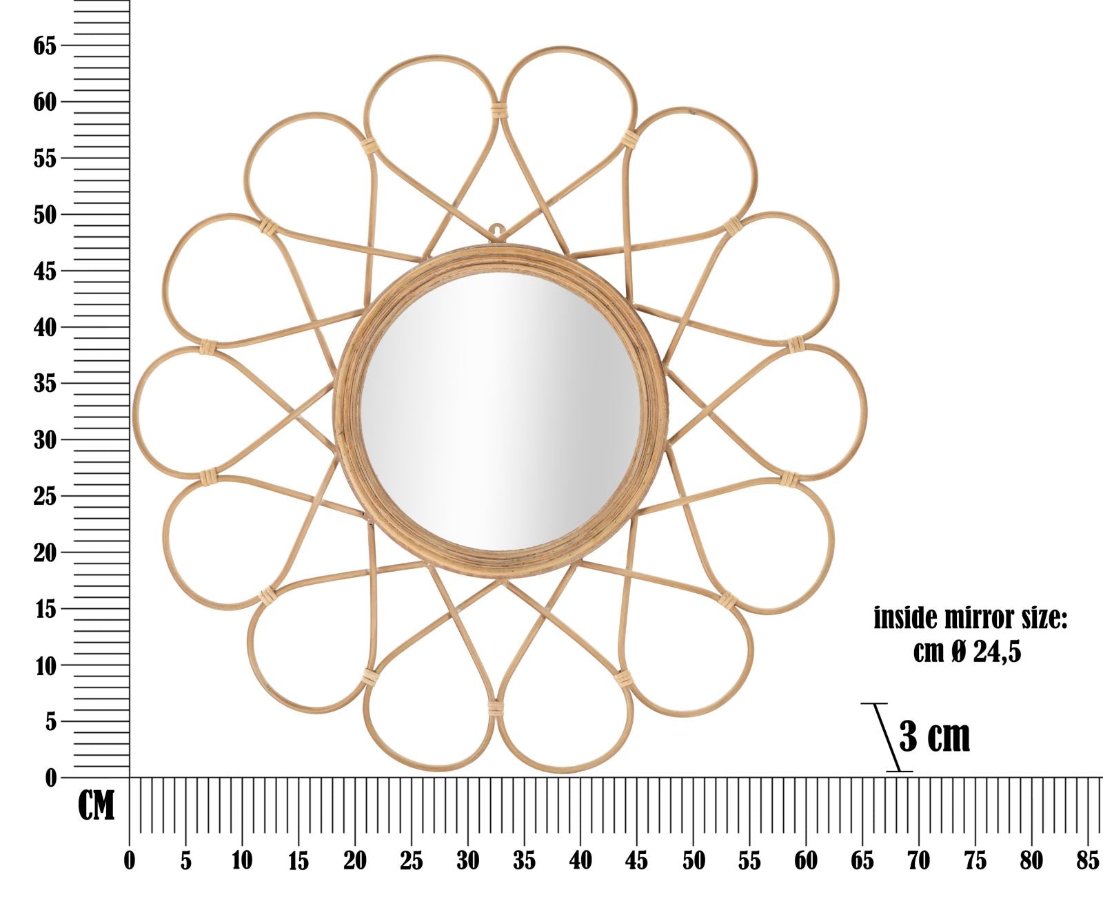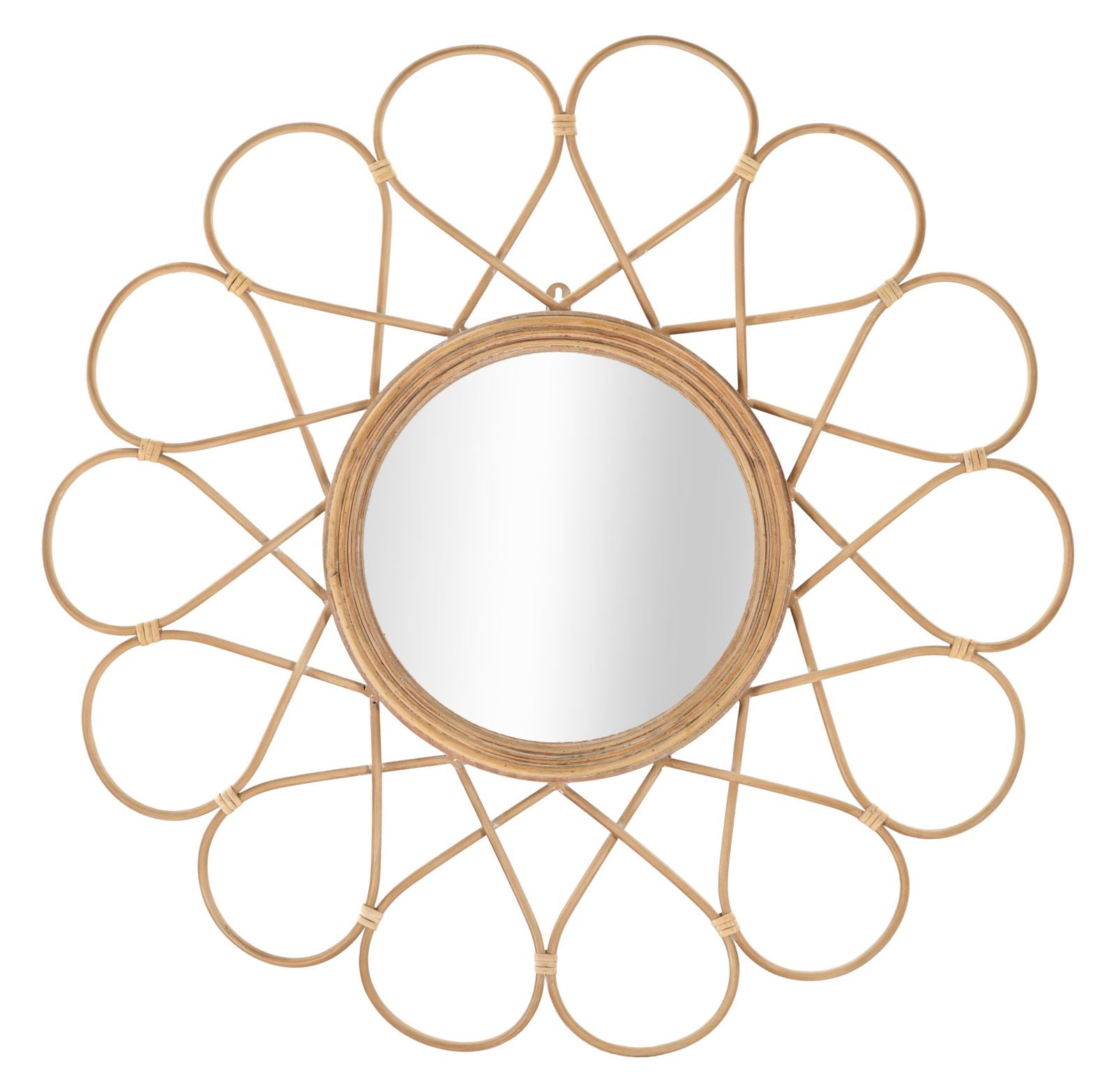 Spejlets ramme er udformet med et geometrisk mønster, der leder tankerne hen på en blomst. Denne særlige udformning, kombineret med den naturlige rattan, skaber et unikt og personligt præg, der tilfører elegance og dybde til ethvert rum.