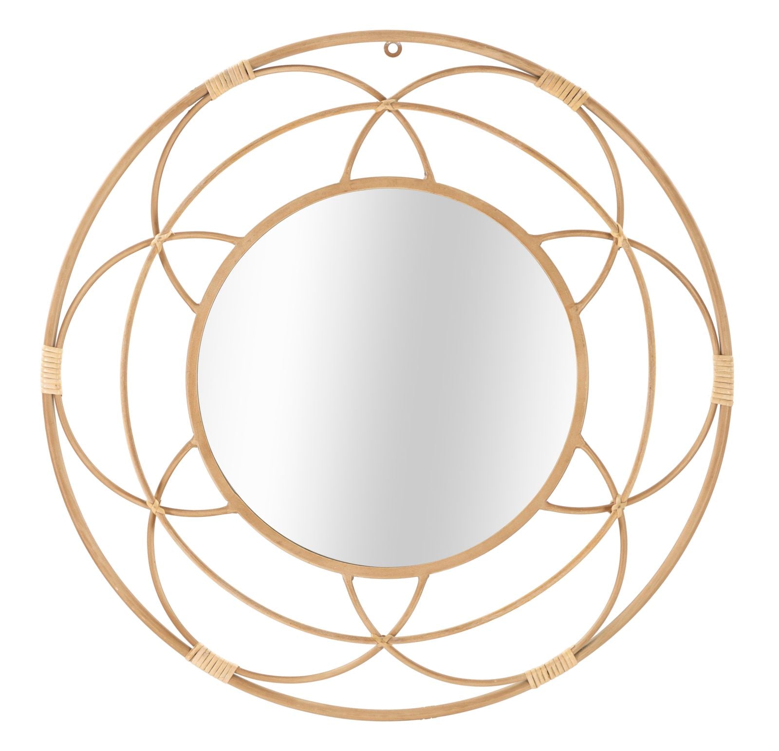 Spejlets ramme er udformet med et geometrisk mønster, der leder tankerne hen på en blomst. Denne særlige udformning, kombineret med den naturlige rattan, skaber et unikt og personligt præg, der tilfører elegance og dybde til ethvert rum.