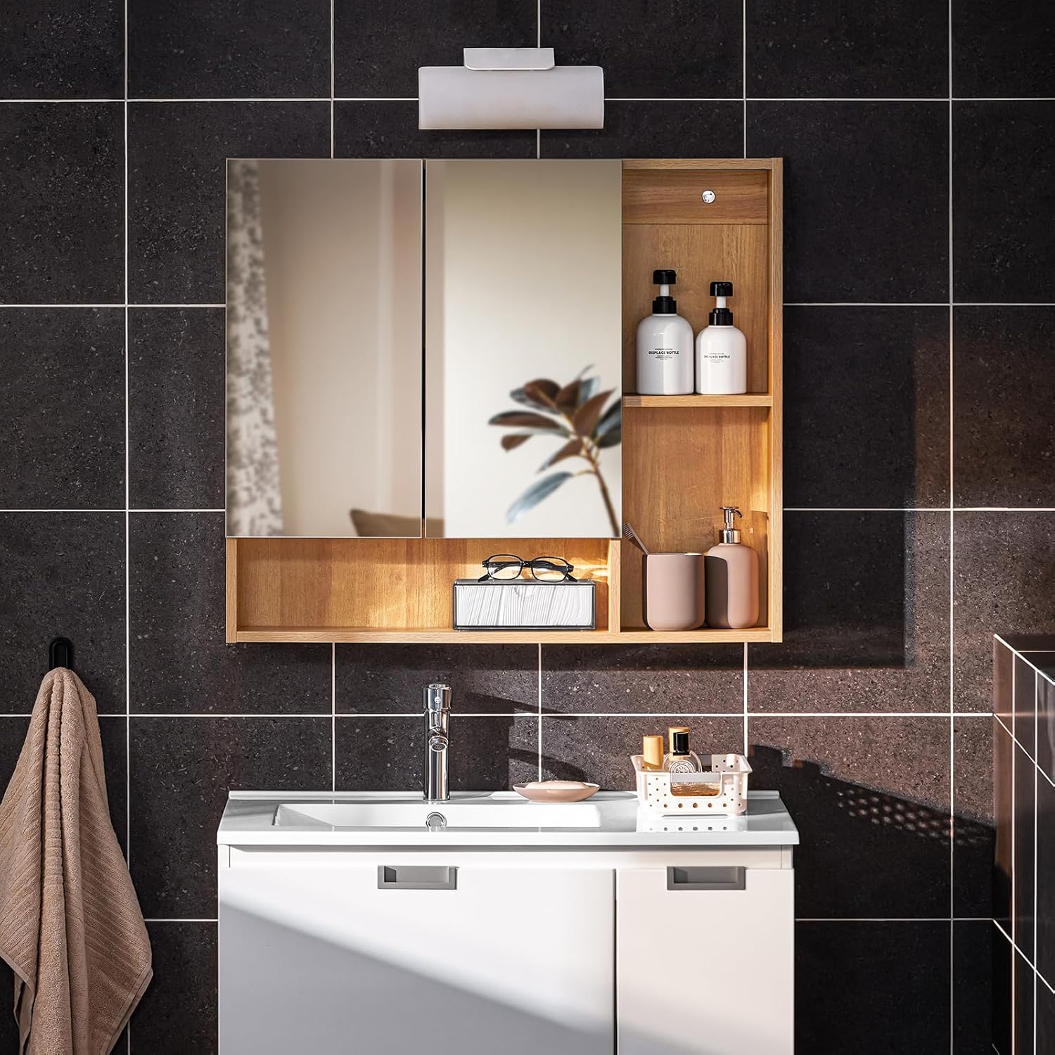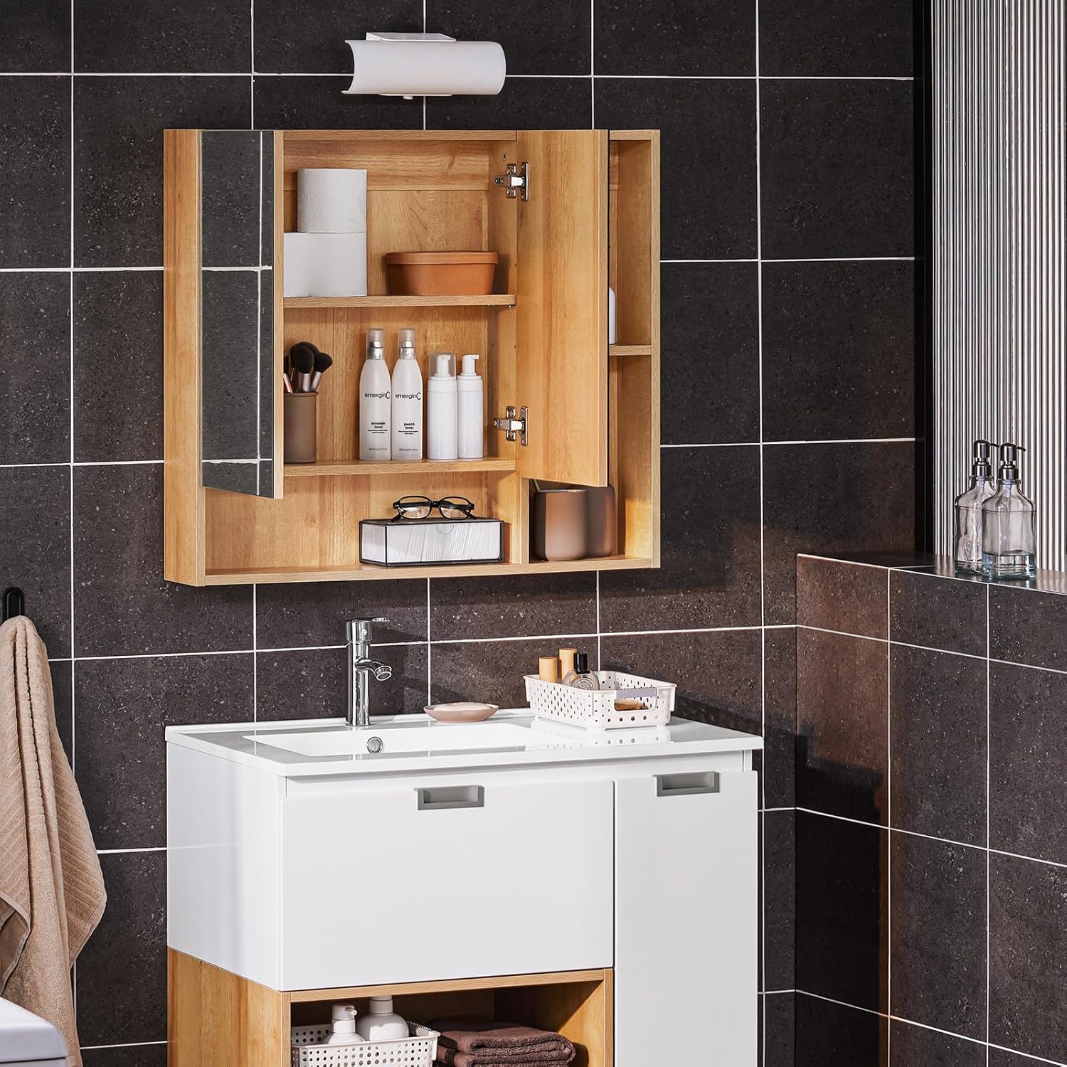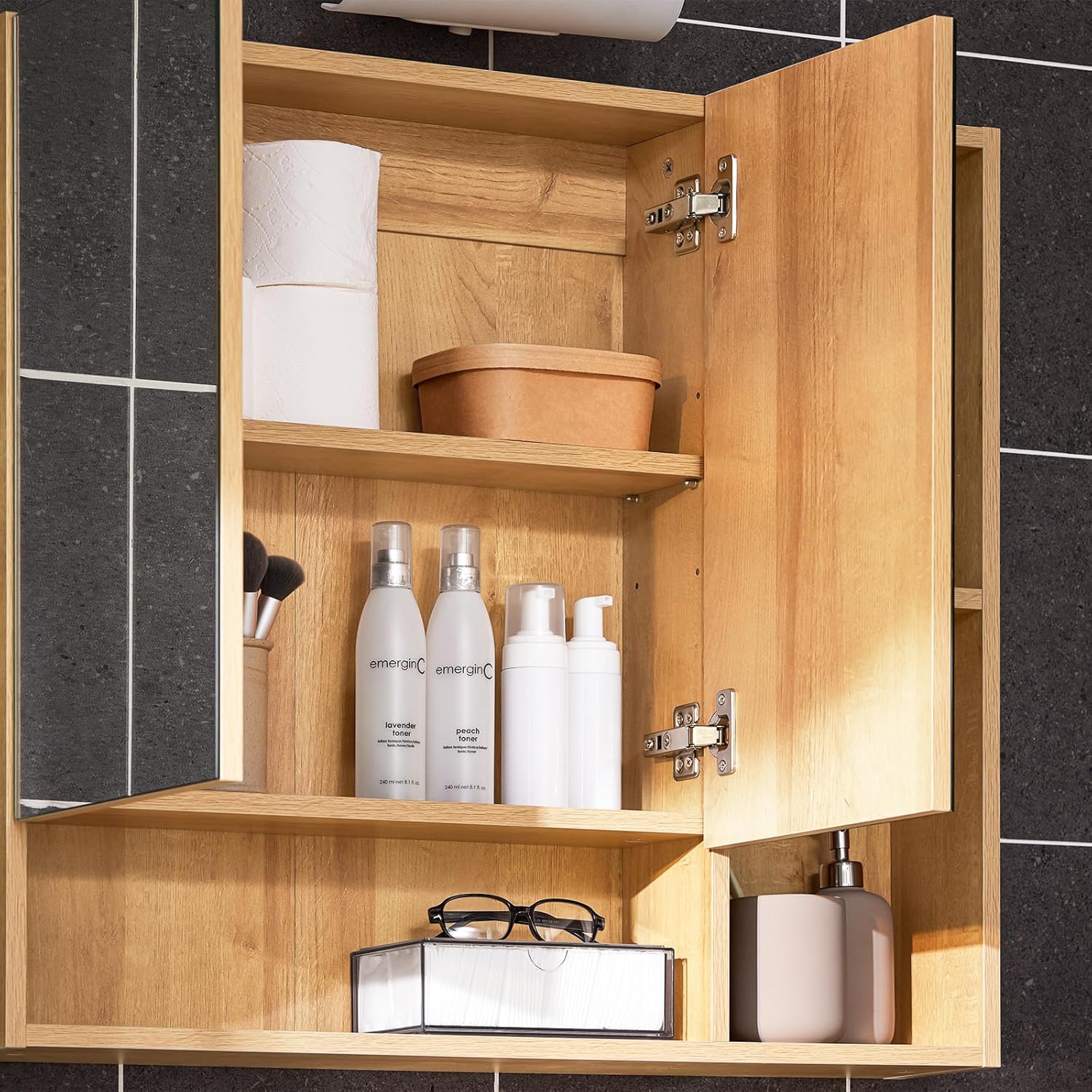 Optimer pladsen på dit badeværelse med dette elegante og praktiske vægskab fra SoBuy. Skabet har en smart spejldør, som kombinerer funktionalitet og stil, uden at det optager ekstra vægplads. Bag spejldøren finder du en justerbar hylde med tre forskellige højder, så du kan tilpasse opbevaringen efter dine behov. De tre åbne hylder er perfekte til opbevaring af ting, du bruger ofte, som f.eks. kamme og tandbørster.