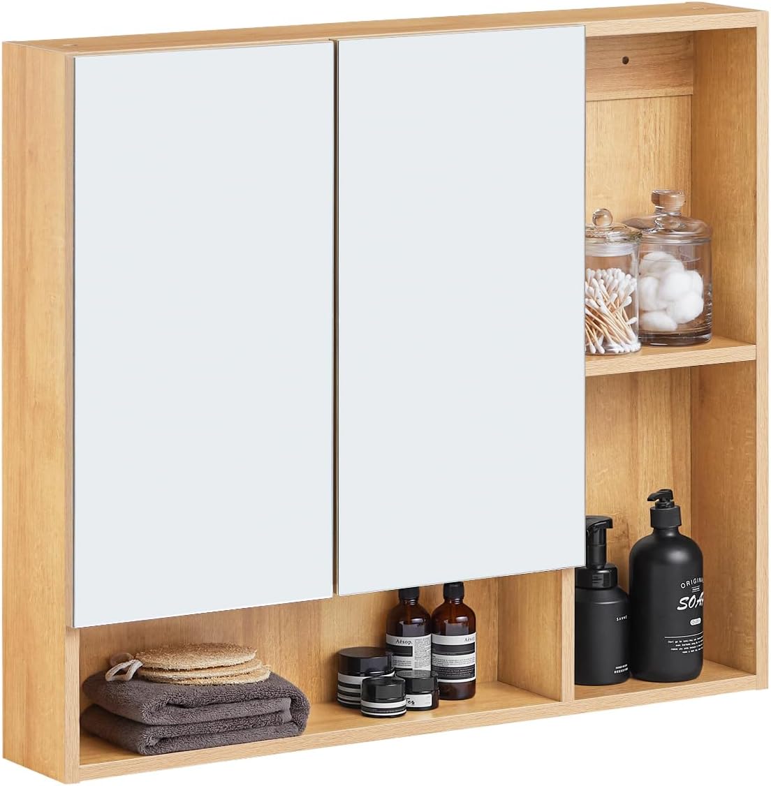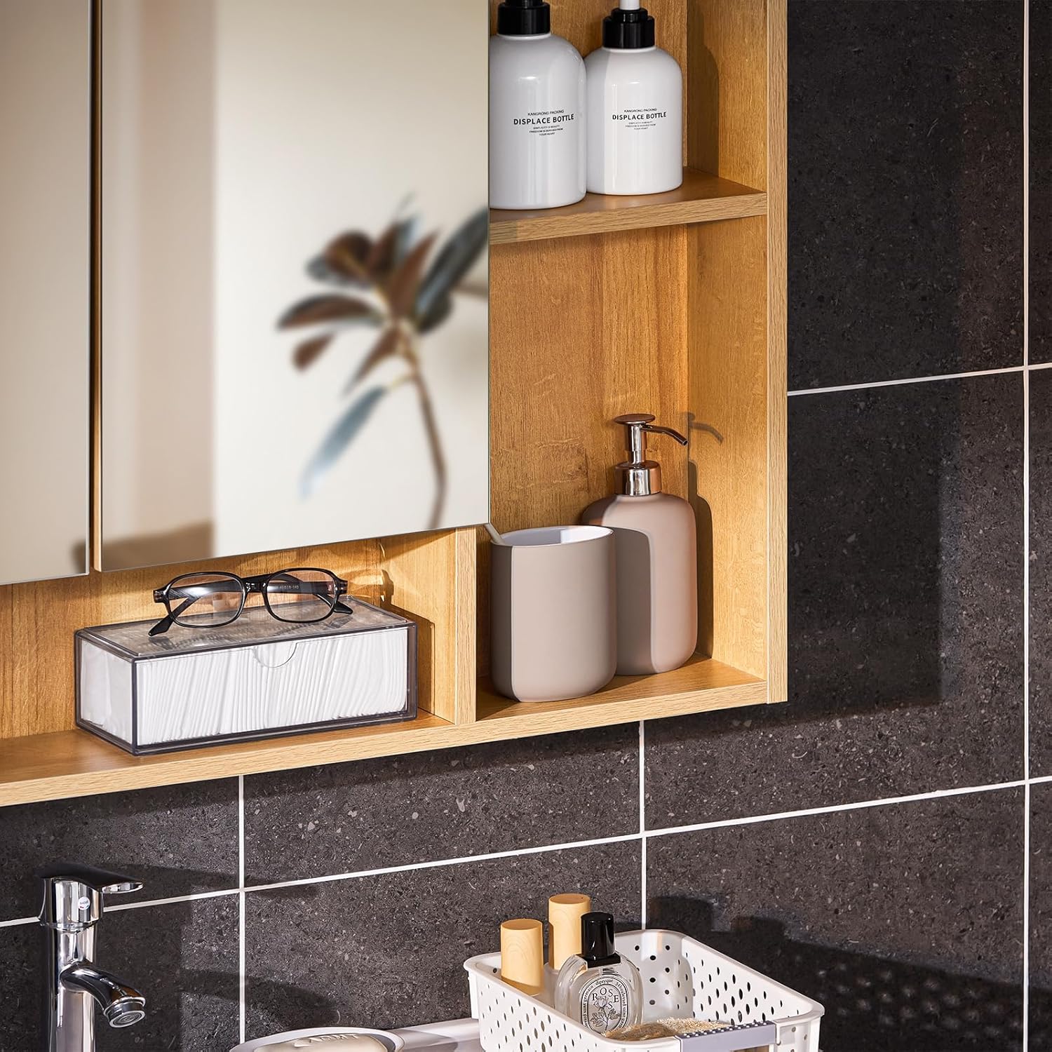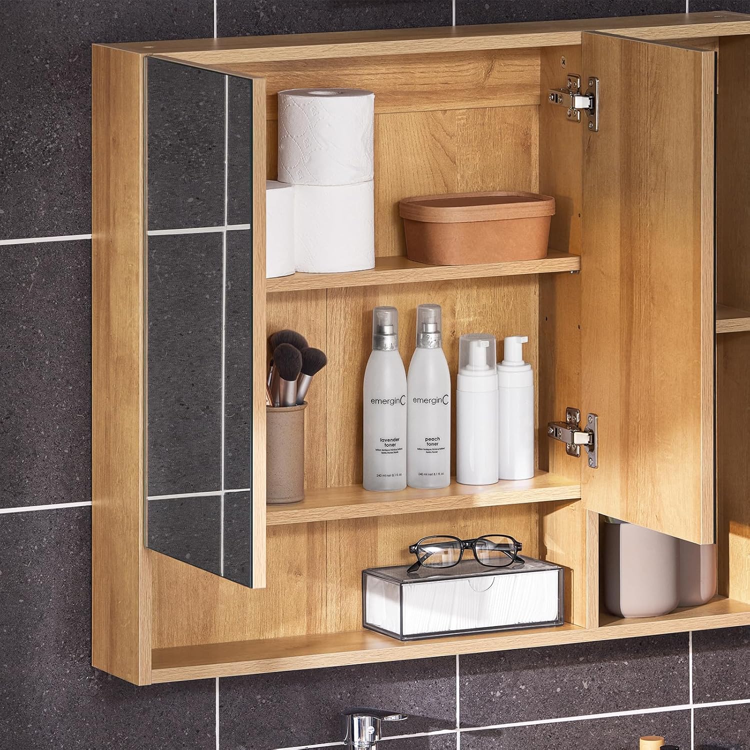 Optimer pladsen på dit badeværelse med dette elegante og praktiske vægskab fra SoBuy. Skabet har en smart spejldør, som kombinerer funktionalitet og stil, uden at det optager ekstra vægplads. Bag spejldøren finder du en justerbar hylde med tre forskellige højder, så du kan tilpasse opbevaringen efter dine behov. De tre åbne hylder er perfekte til opbevaring af ting, du bruger ofte, som f.eks. kamme og tandbørster.