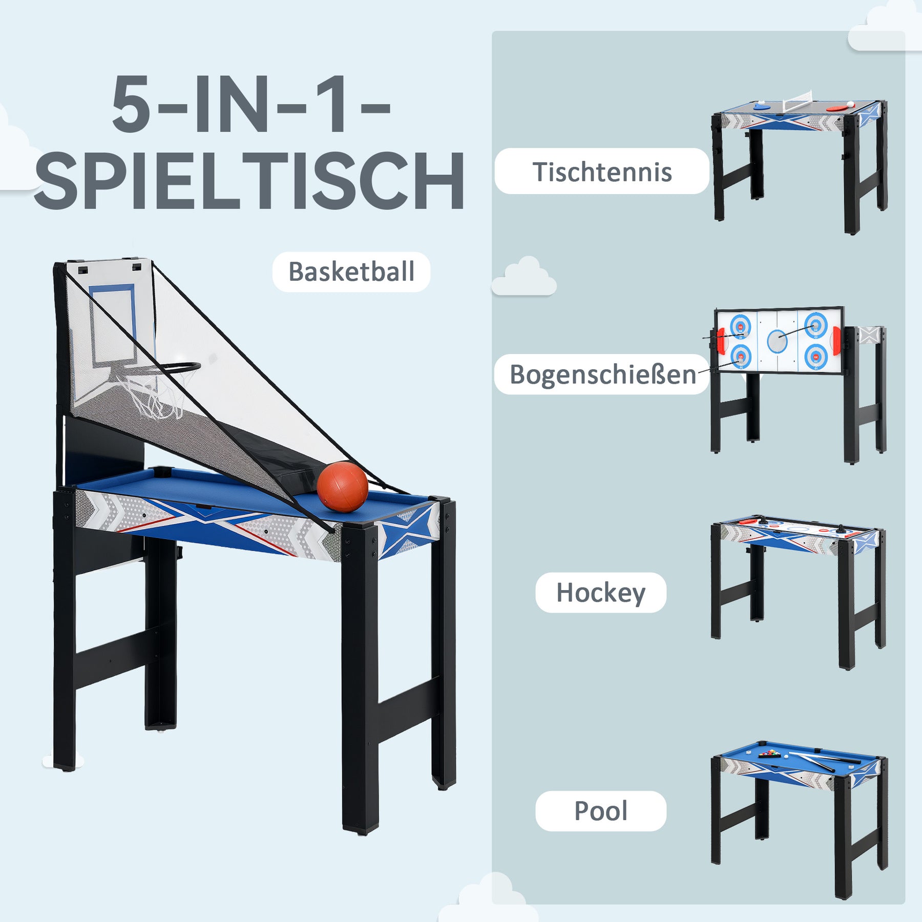 Multispilbordet kombinerer fem spændende spil – billard, bordtennis, bueskydning, hockey og basketball – i én enhed. Alt nødvendigt tilbehør er inkluderet, og det er hurtigt og nemt at skifte mellem spil. Designet til sjov med familie og venner, garanterer det timevis af nydelse og fremmer samvær.