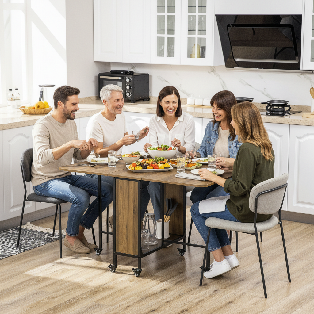Vælg dette foldbare spisebord for at spare plads, når det er nødvendigt. Dets foldbare design, hvor begge sider løftes fra bunden, skaber ekstra plads og kan nemt foldes sammen til en kompakt enhed. Spisebordet har en midterhylde til diskret opbevaring af forskellige genstande, samt seks hjul med bremser til at flytte det efter behov.