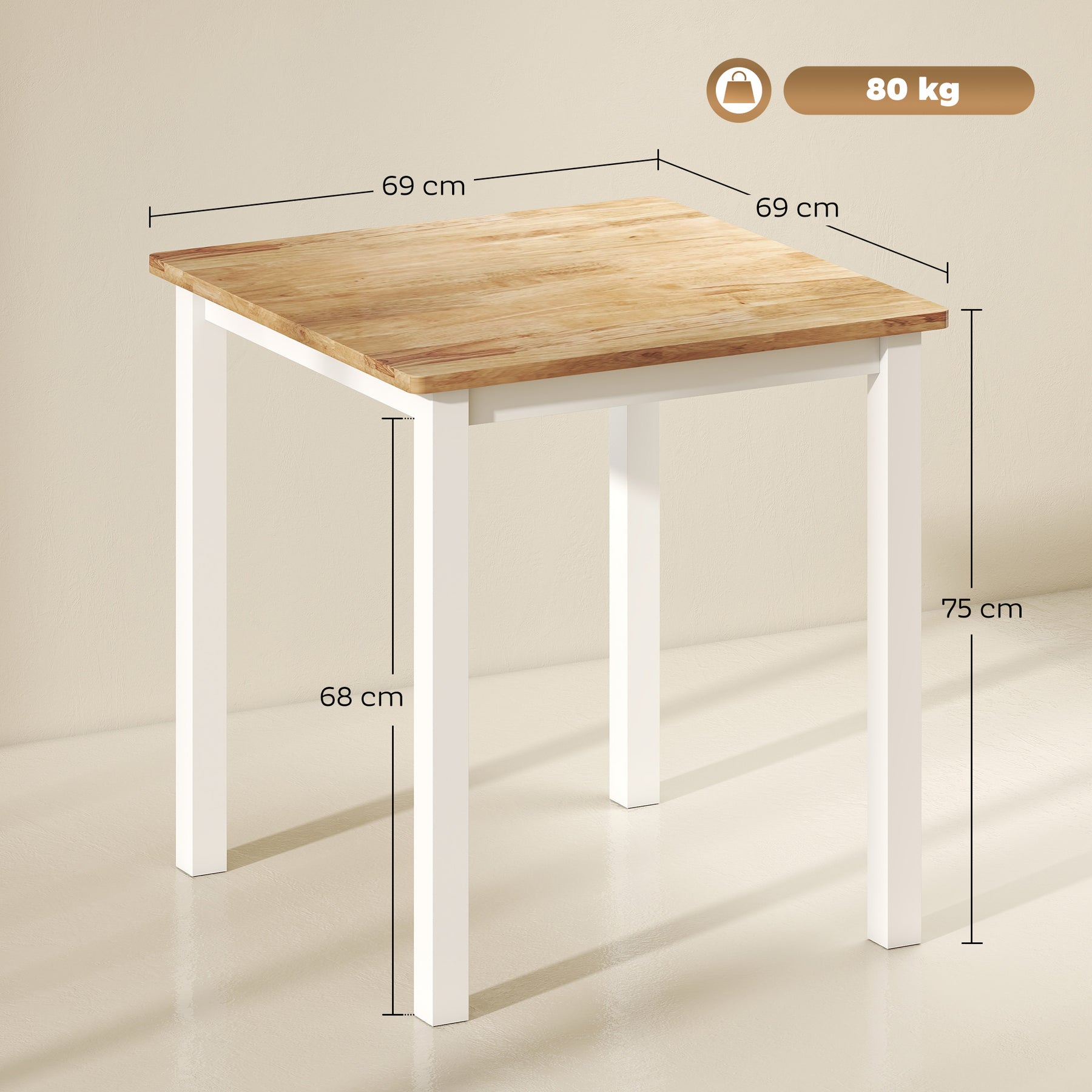 Nyd en hyggelig aften ved spisebordet, omgivet af dine kære. Dette træs bord er fremstillet af robust gummitræ og skaber et sikkert og miljøvenligt samlingssted for familien. Med sin egetræs bordplade og hvide ramme passer det perfekt ind i moderne eller landlige køkkener og giver dit hjem en varm atmosfære.