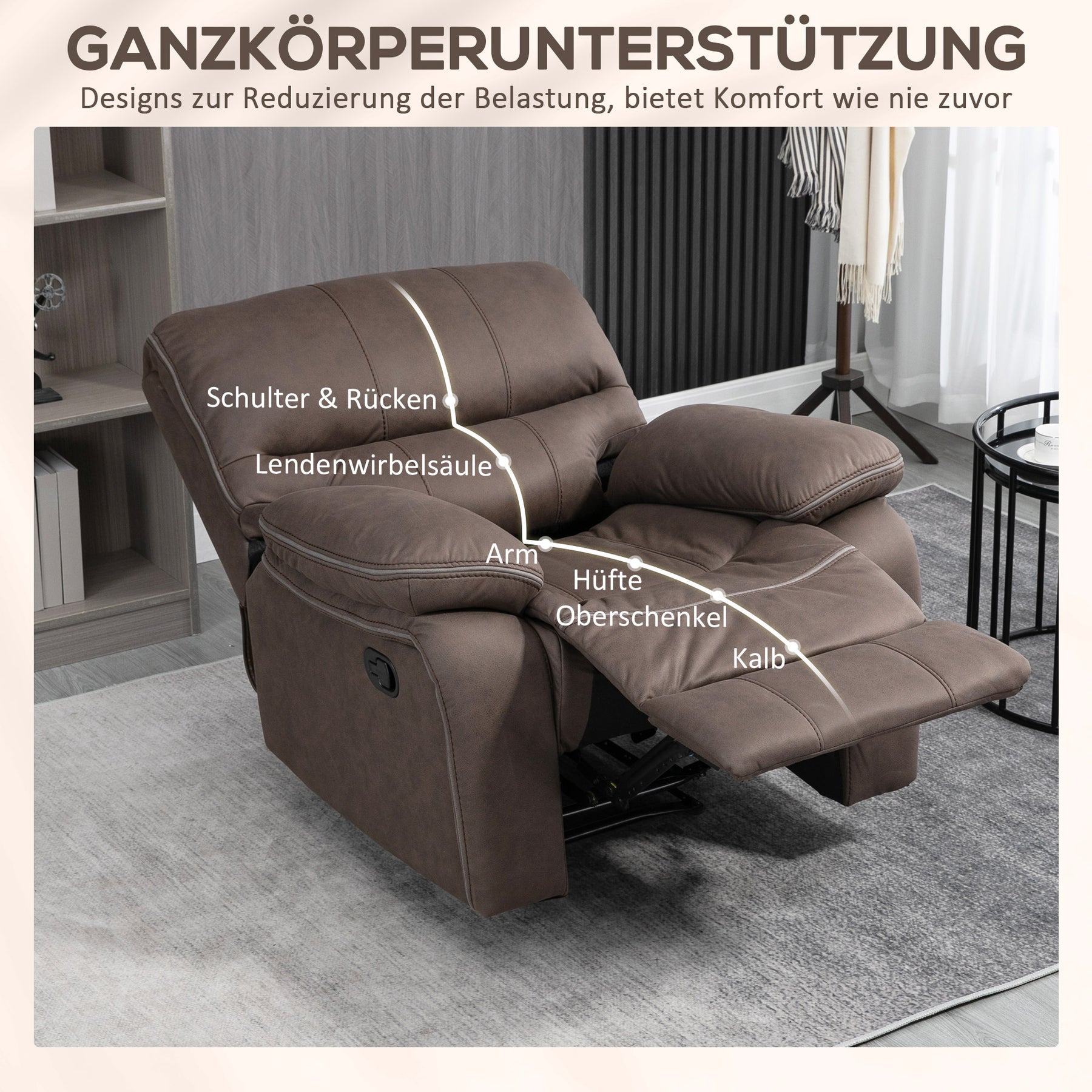 Polstret lænestol med fodstøtte, hvilestol med lænefunktion, mikrofiberbetræk i læderlook, metalstruktur, brun