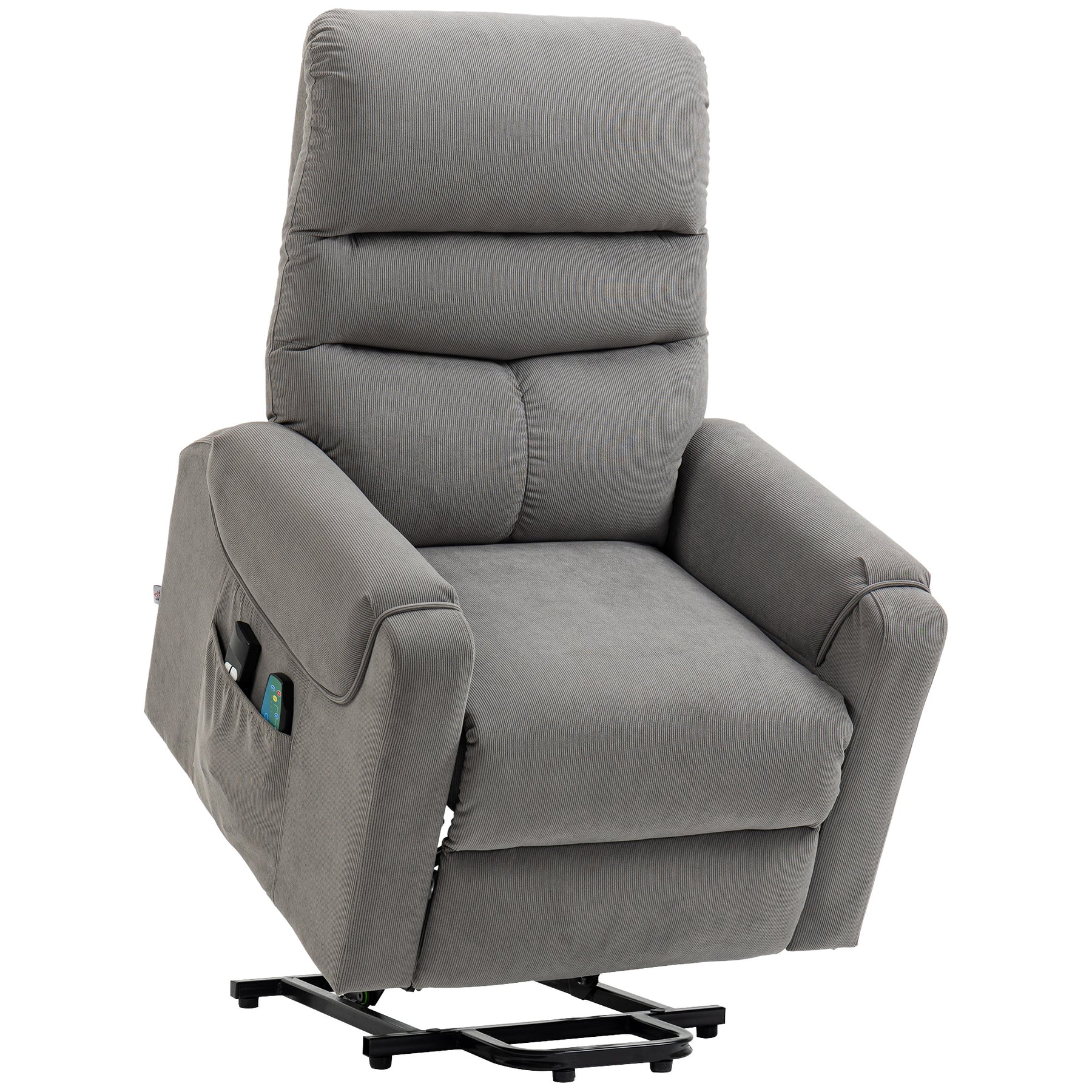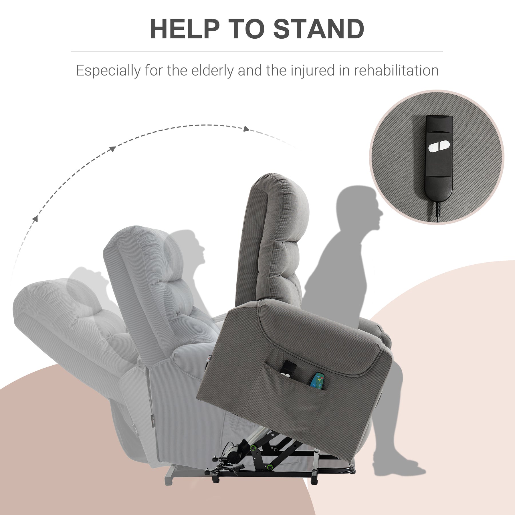 Tv-stol med elektrisk hæve-sænke, massagestol med lænefunktion og varmefunktion, afslapningsstol med fjernbetjening og sidelomme, justerbart polyesterstof, mørkegrå
