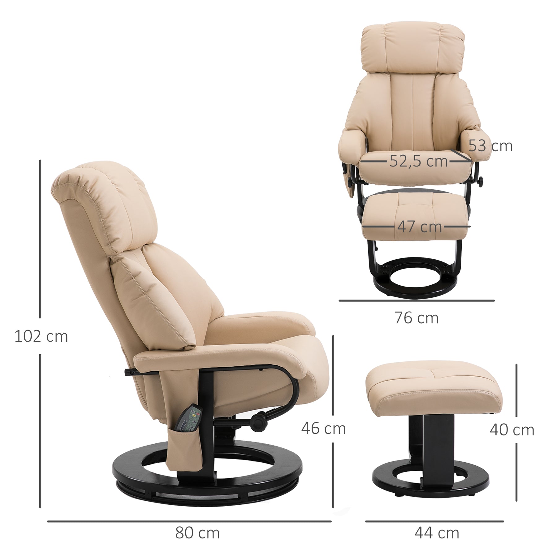 Afslappende lænestol med skammel, drejelig tv-stol med massagefunktion, lænefunktion, massagestol med fjernbetjening, sidelomme, lænestol i kunstlæder til stue cremehvid