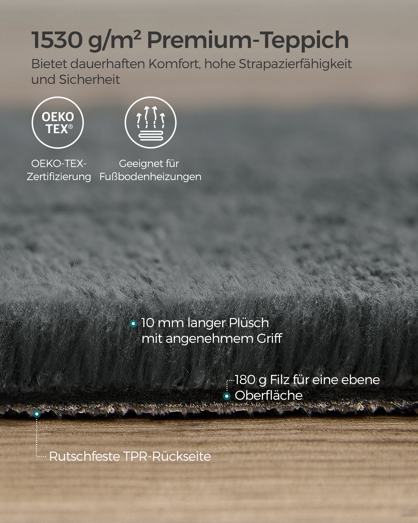 Dette tæppe er fremstillet af 100% polyesterfibre med en blød og behagelig overflade. Det er OEKO-TEX Standard 100-certificeret, hvilket garanterer, at det opfylder de strengeste sikkerhedsstandarder for tekstiler.