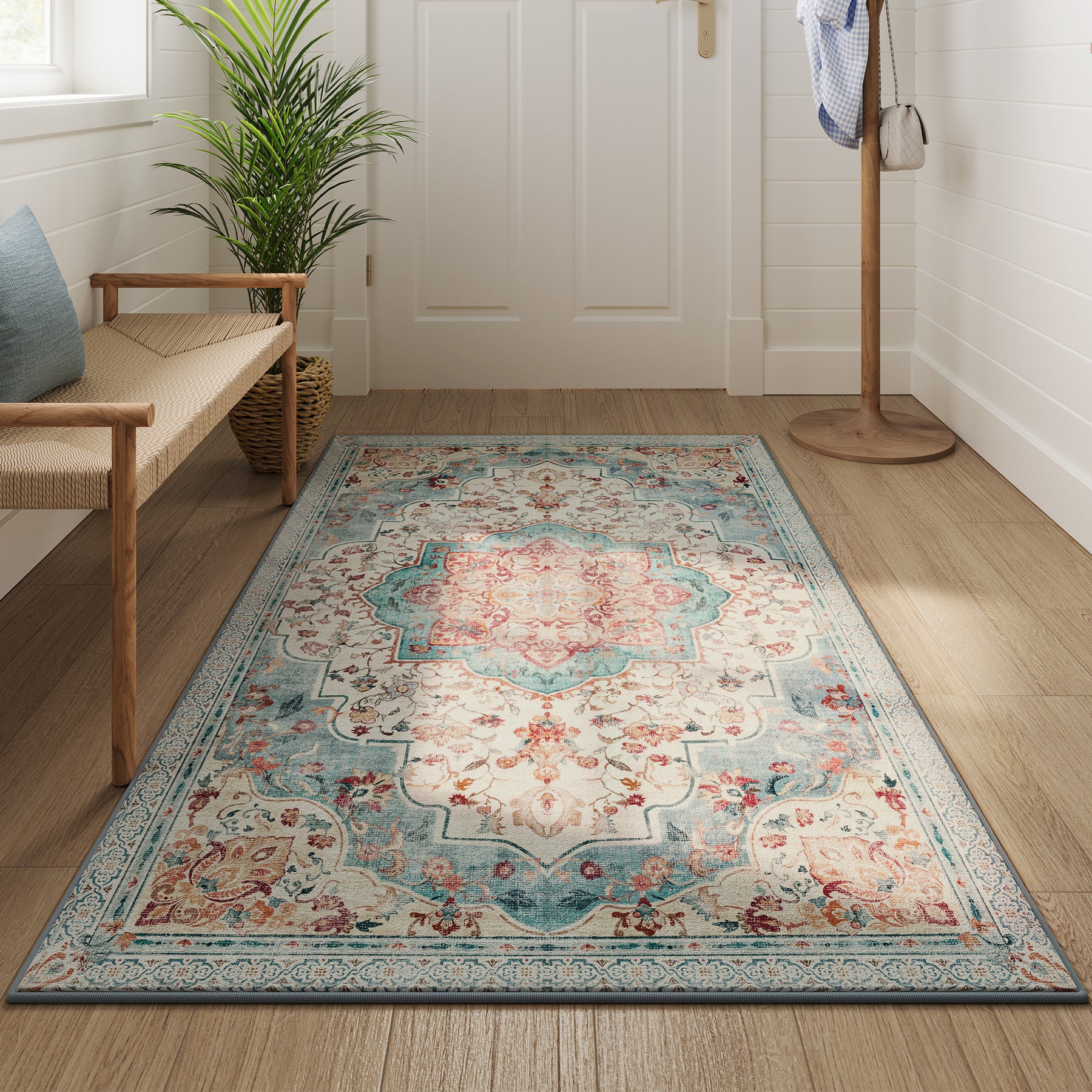 Med sine intrikate mønstre og rige farver tilfører dette tæppe et unikt og elegant udtryk til dit rum og giver det et strejf af nostalgisk charme.