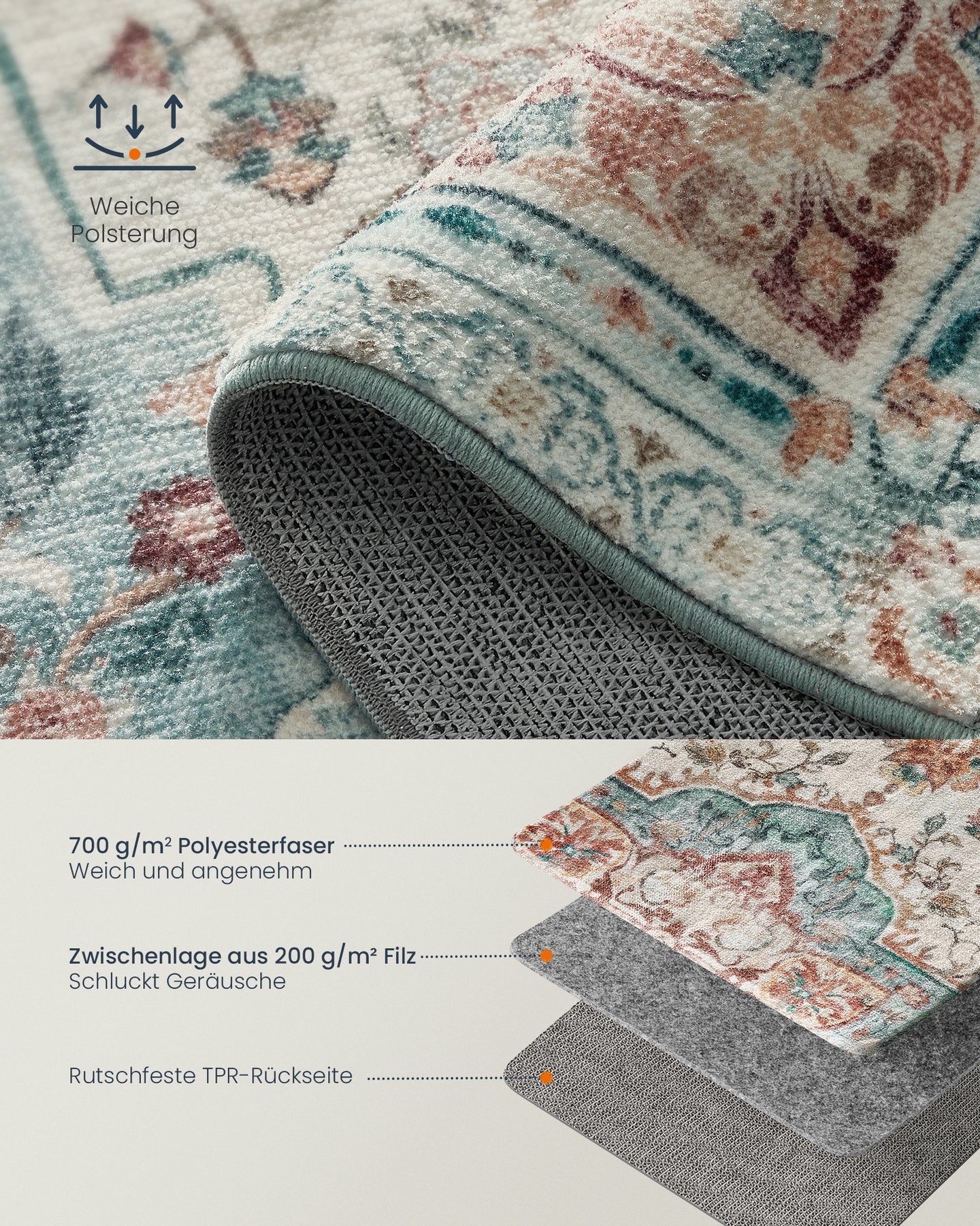 Med en overflade af 700 g polyesterfibre og et mellemlag af 200 g filt er det en sand fornøjelse at gå på tæppet, og det er perfekt til afslapning. Bagsiden af tæppet er lavet af TPR, som er særdeles skridsikkert, hvilket gør det egnet til alle slags gulve.